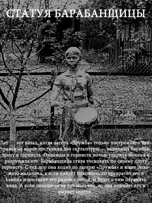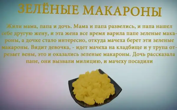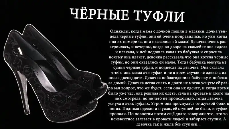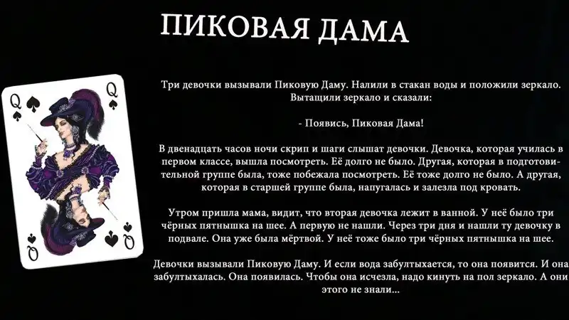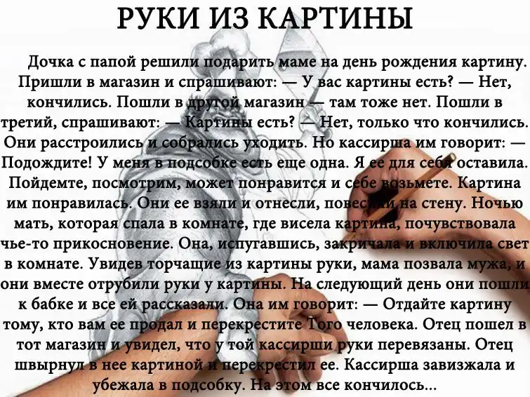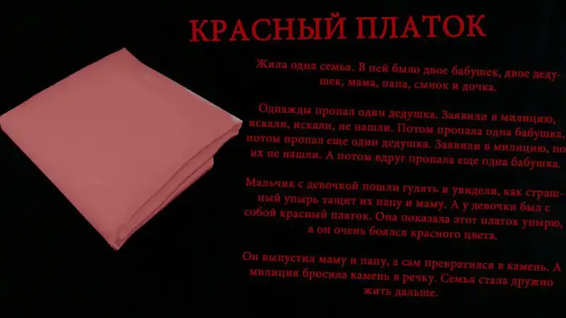 "Одна старая женщина, когда помирала, сказала своей дочери: "Ты что хочешь делай, только Винт в Полу не трогай. А то будет большая беда". И умерла. А дочка все время об тот Винт спотыкалась. Однажды она взяла газовый ключ и гайку отвинтила. Как раз была полночь. И вдруг в дверь к дочери постучали. Она в гляделочку посмотрела и видит: за дверью стоит женщина с нижнего этажа, вся в крови. И в руках люстру держит."