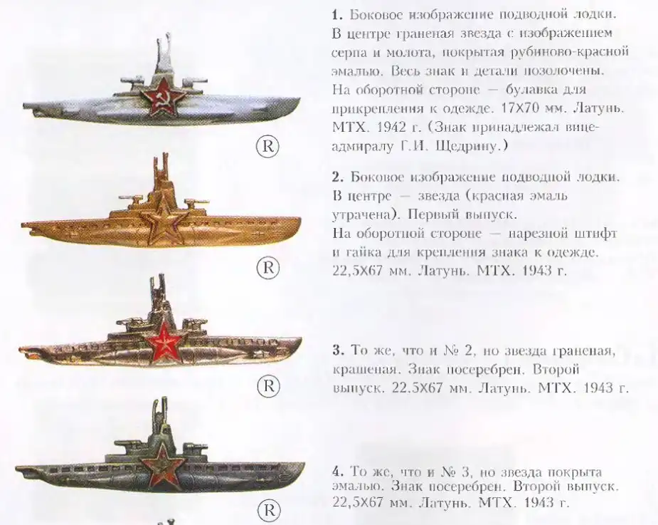 Знак «Командир подводной лодки» — учреждён приказом НК ВМФ СССР № 170 от 12 июня 1942 г. Знак представлял изображение подводной лодки типа «Щ», в центре которой помещена красная звезда с серпом и молотом. Знак латунный с золочением.