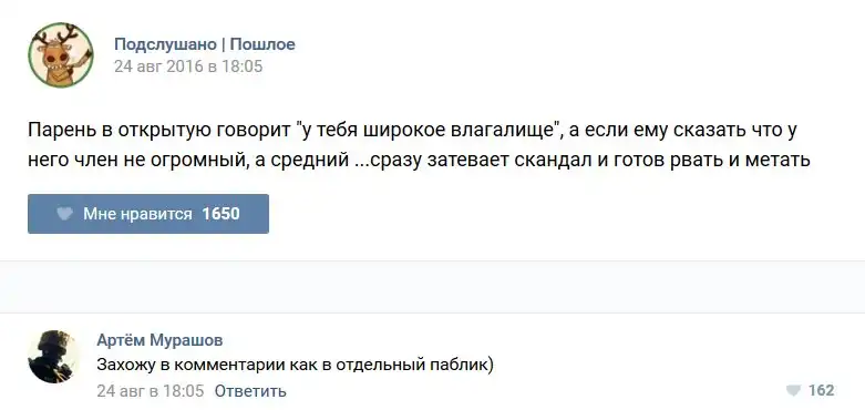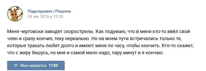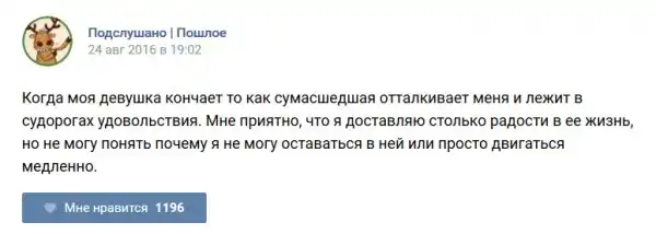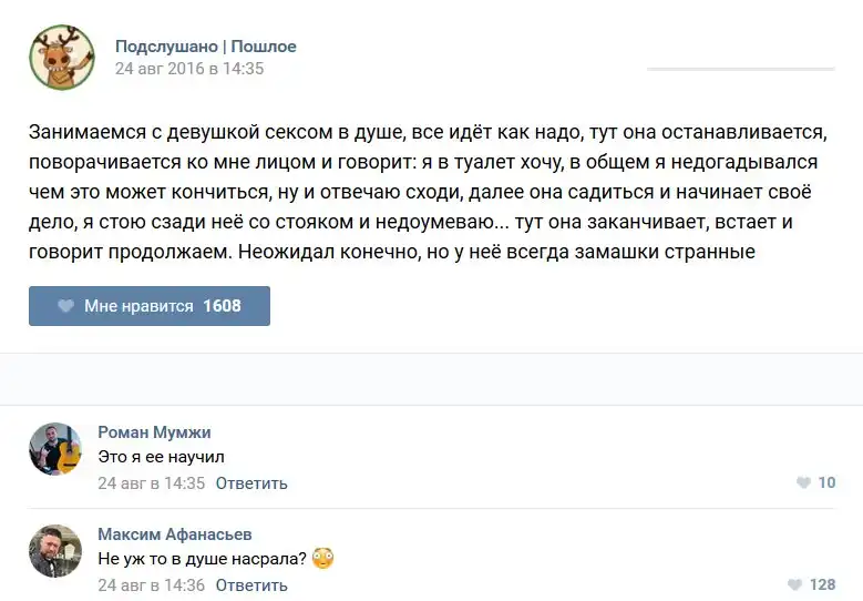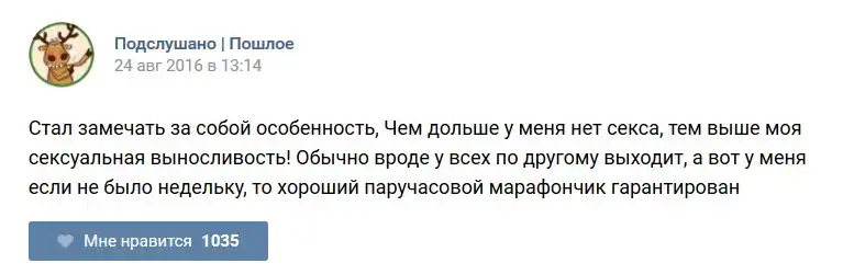 У каждого человека есть своя любимая группа или любимое сообщество в какой-либо социальной сети. Иногда это группа не совсем приличная, поэтому нет возможности в открытом режиме подписаться на неё и прочитывать свежие посты. Мы предлагаем вам очередную порцию из серии интересных постов в группе «Подслушано пошлое». Сегодняшняя запись: Подслушано пошлое (25 фото) предлагает посмотреть несколько интересных и запоминающихся постов, вместе с комментариями из данной группы в социальной сети ВКонтакте.