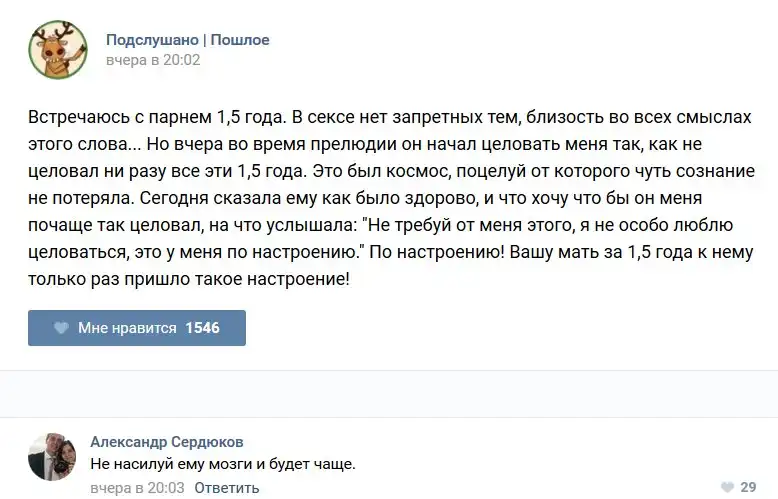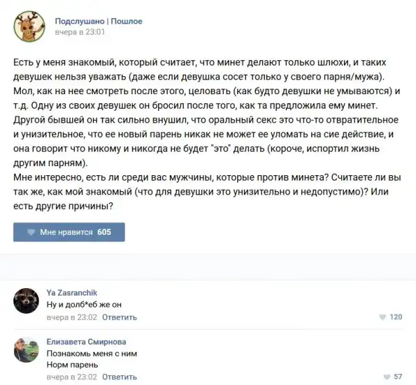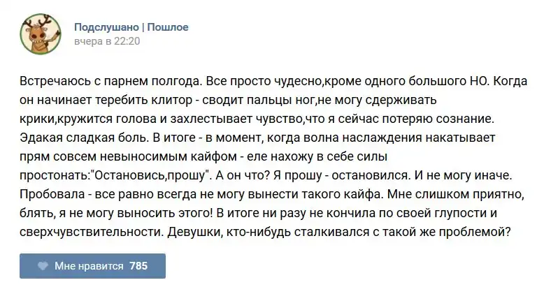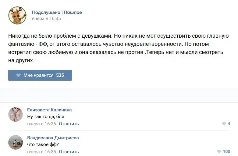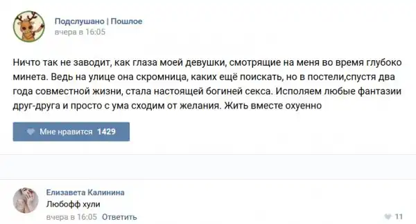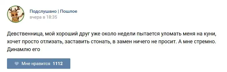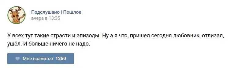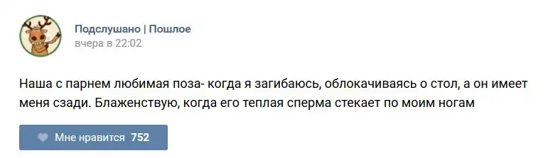 У каждого человека есть своя любимая группа или любимое сообщество в какой-либо социальной сети. Иногда это группа не совсем приличная, поэтому нет возможности в открытом режиме подписаться на неё и прочитывать свежие посты. Мы предлагаем вам очередную порцию из серии интересных постов в группе «Подслушано пошлое». Сегодняшняя запись: Подслушано пошлое (25 фото) предлагает посмотреть несколько интересных и запоминающихся постов, вместе с комментариями из данной группы в социальной сети ВКонтакте.
