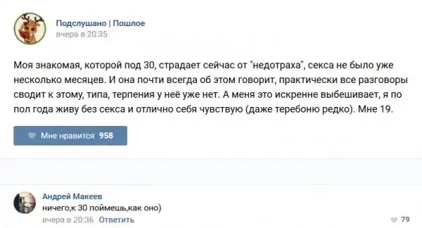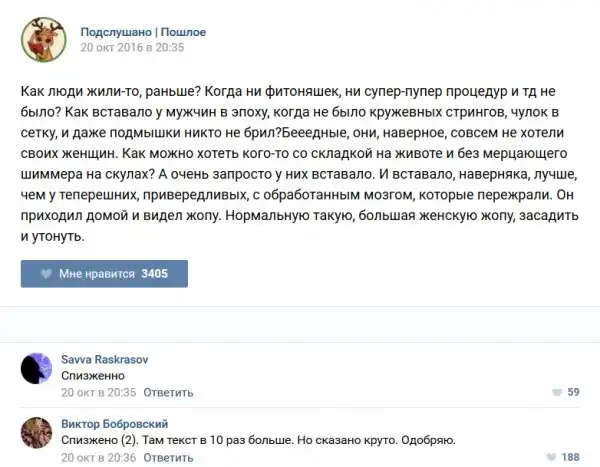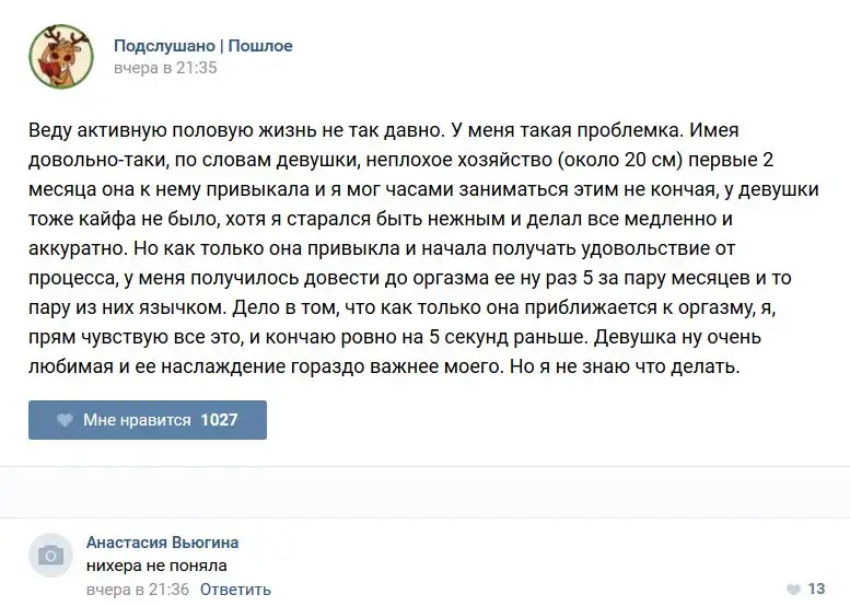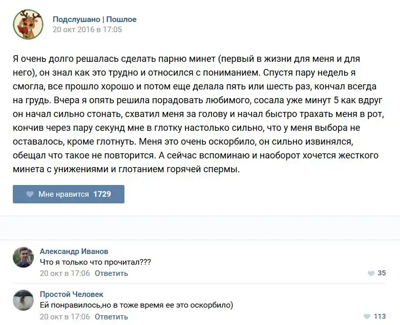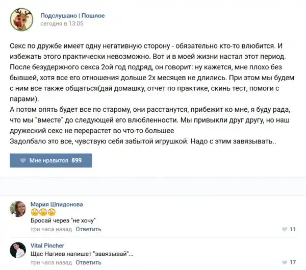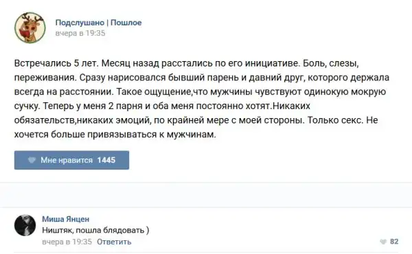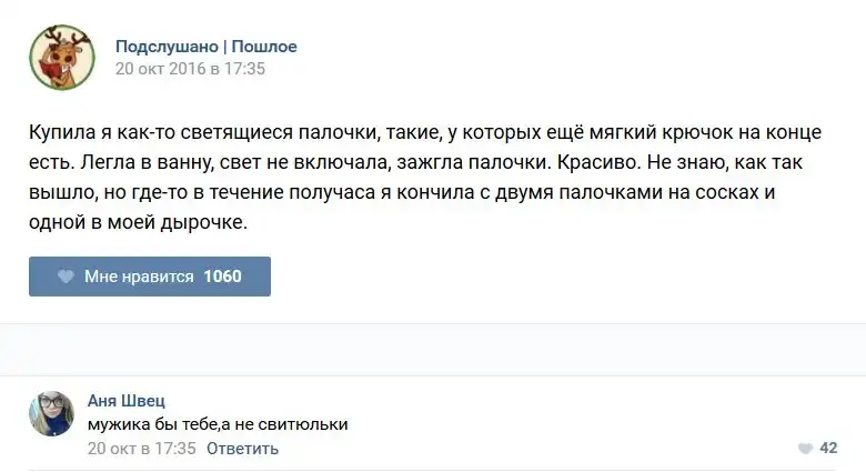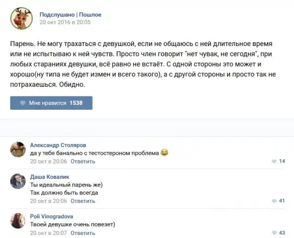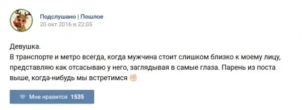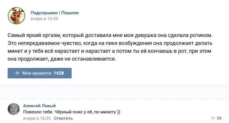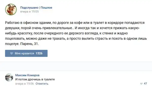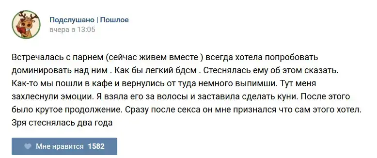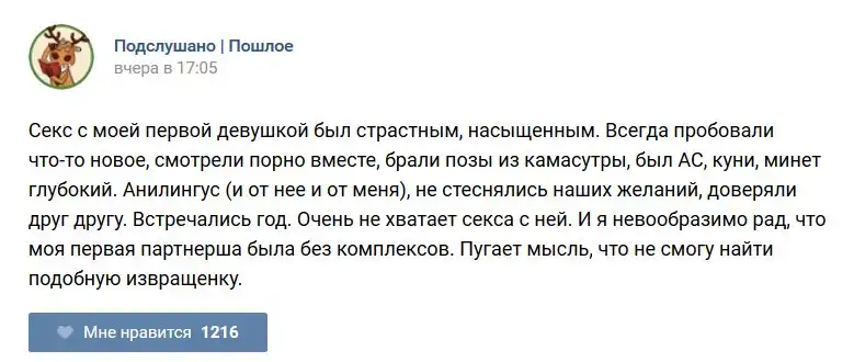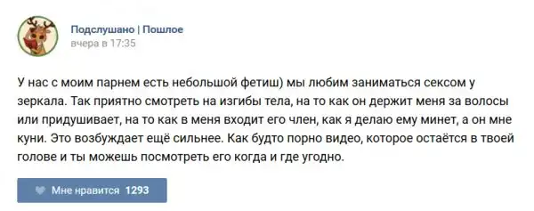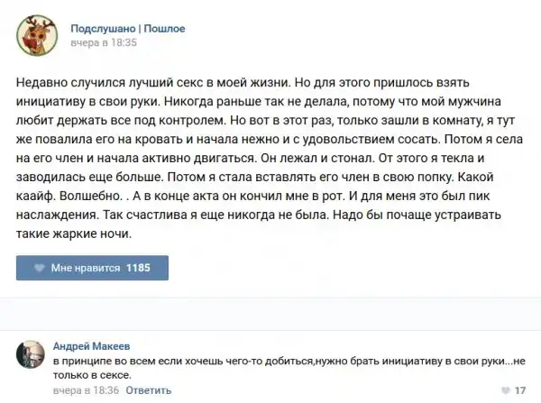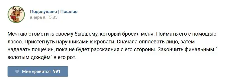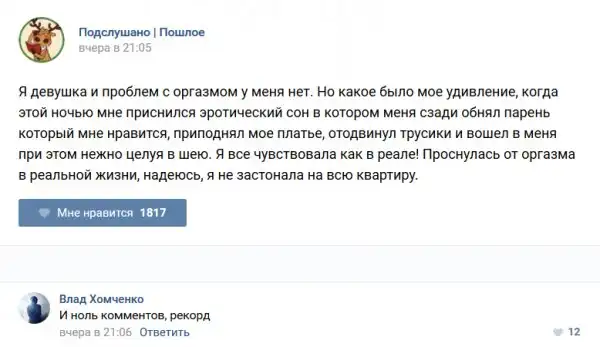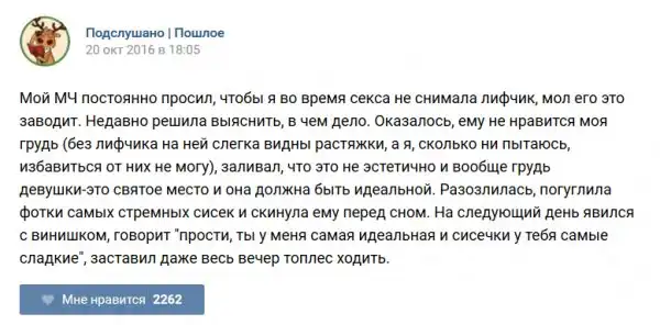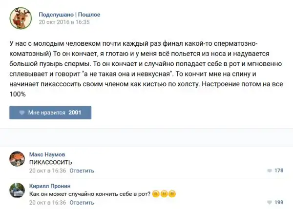 У каждого человека есть своя любимая группа или любимое сообщество в какой-либо социальной сети. Иногда это группа не совсем приличная, поэтому нет возможности в открытом режиме подписаться на неё и прочитывать свежие посты. Мы предлагаем вам очередную порцию из серии интересных постов в группе «Подслушано пошлое». Сегодняшняя запись: Подслушано пошлое предлагает посмотреть несколько интересных и запоминающихся постов, вместе с комментариями из данной группы в социальной сети ВКонтакте.