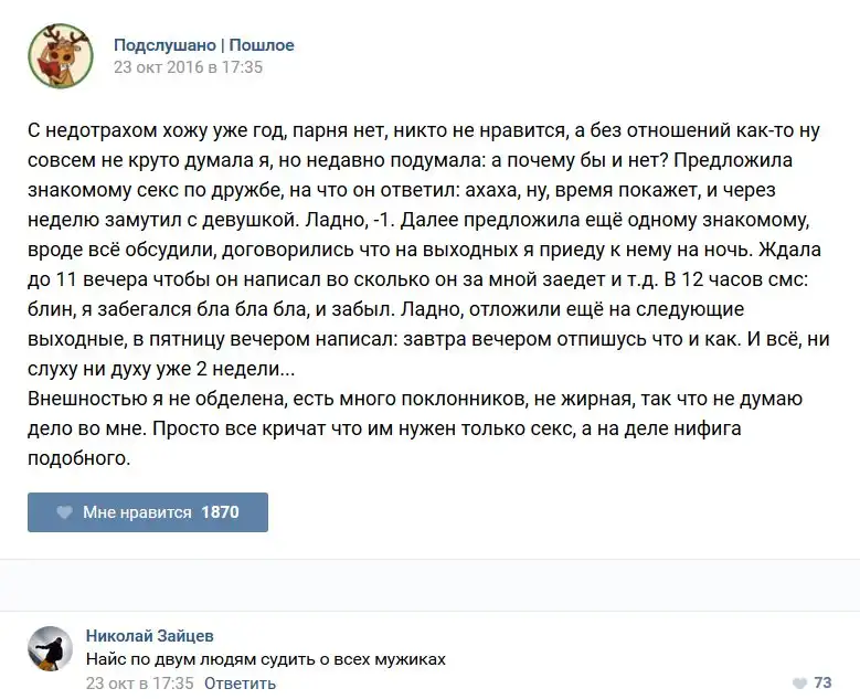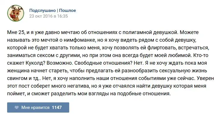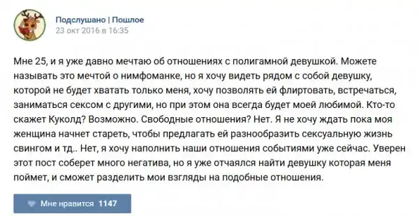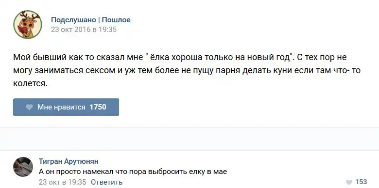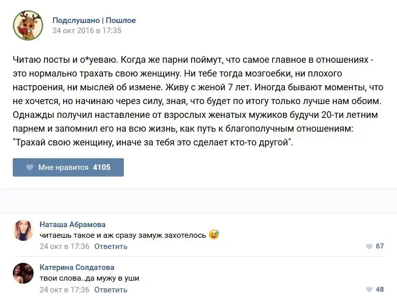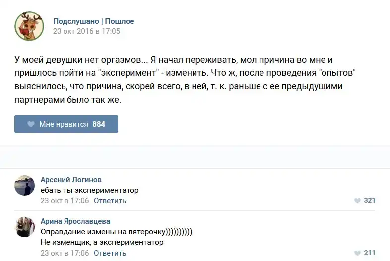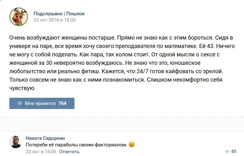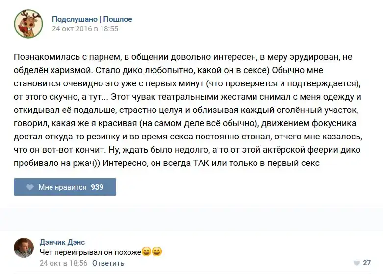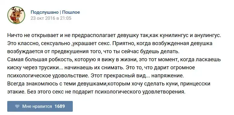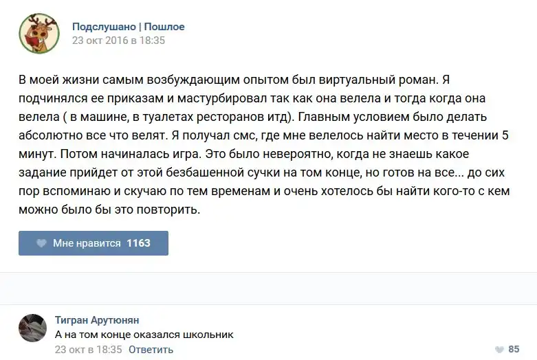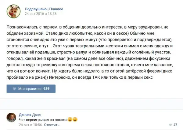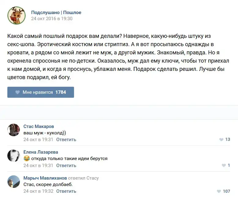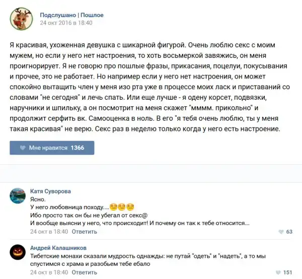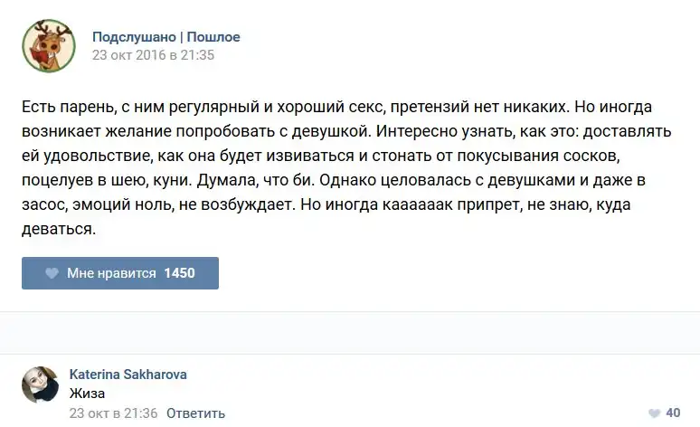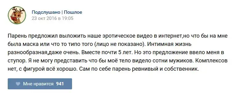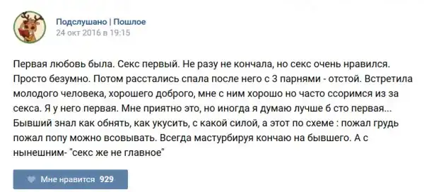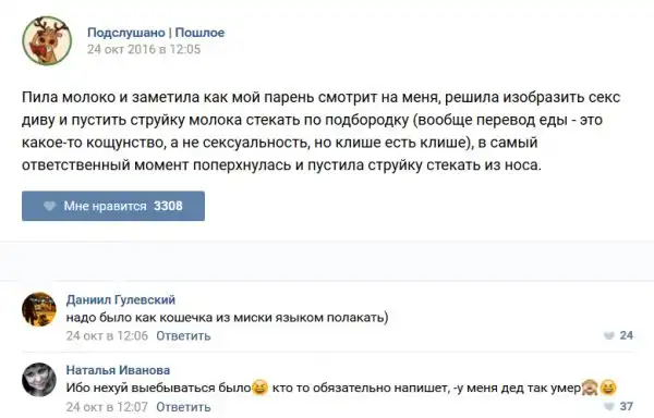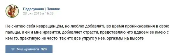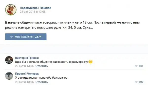 У каждого человека есть своя любимая группа или любимое сообщество в какой-либо социальной сети. Иногда это группа не совсем приличная, поэтому нет возможности в открытом режиме подписаться на неё и прочитывать свежие посты. Мы предлагаем вам очередную порцию из серии интересных постов в группе «Подслушано пошлое». Сегодняшняя запись: Подслушано пошлое предлагает посмотреть несколько интересных и запоминающихся постов, вместе с комментариями из данной группы в социальной сети ВКонтакте.