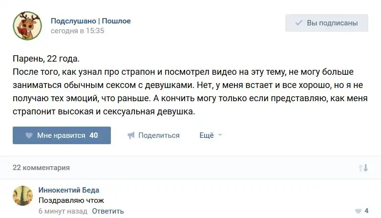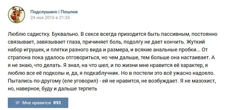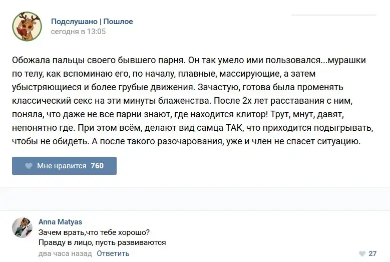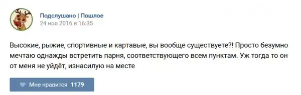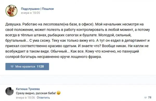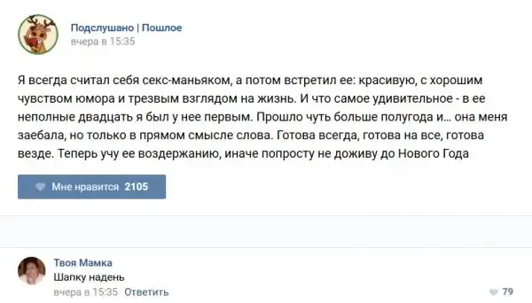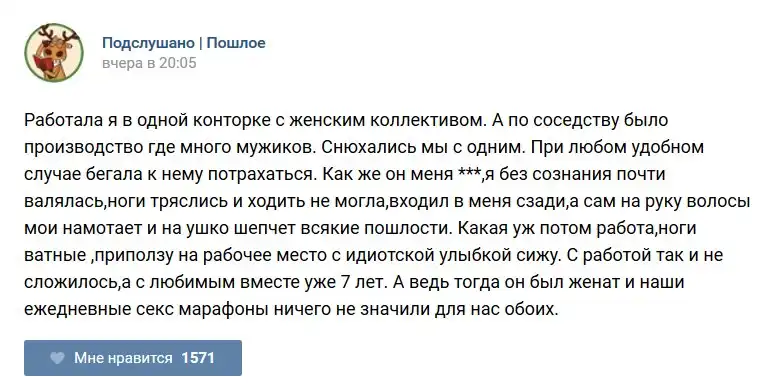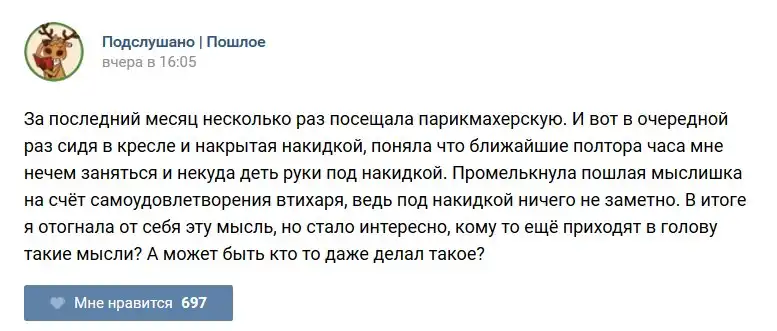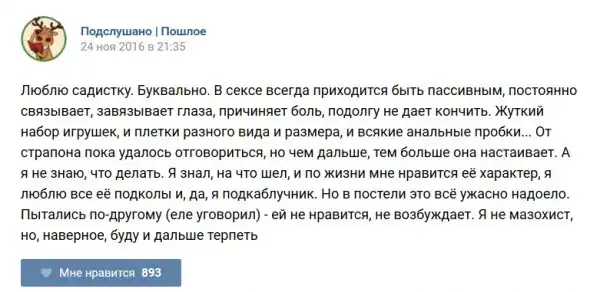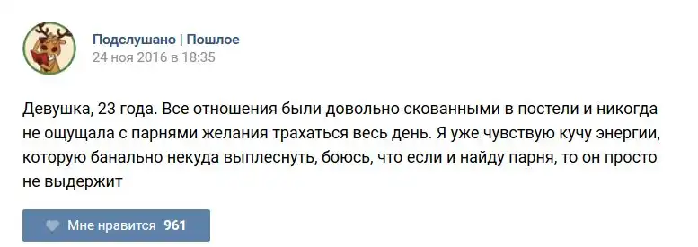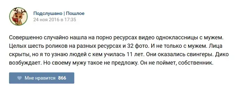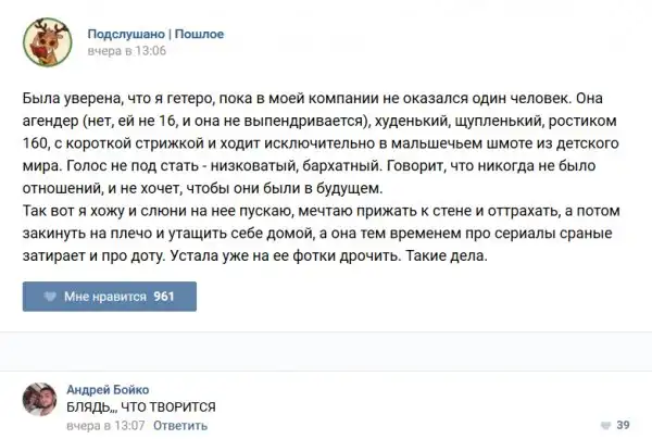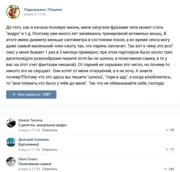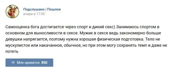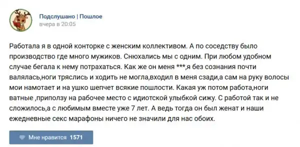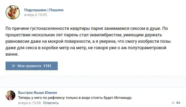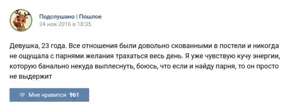У каждого человека есть своя любимая группа или любимое сообщество в какой-либо социальной сети. Иногда это группа не совсем приличная, поэтому нет возможности в открытом режиме подписаться на неё и прочитывать свежие посты. Мы предлагаем вам очередную порцию из серии интересных постов в группе «Подслушано пошлое». Сегодняшняя запись: Подслушано пошлое предлагает посмотреть несколько интересных и запоминающихся постов, вместе с комментариями из данной группы в социальной сети ВКонтакте.
