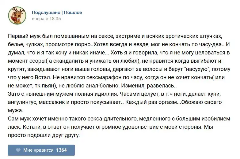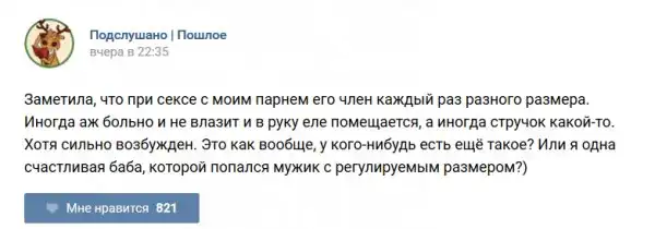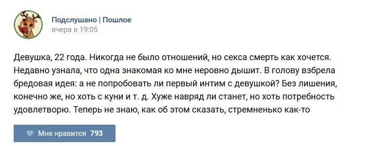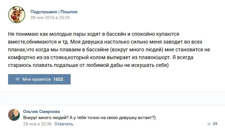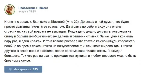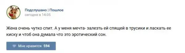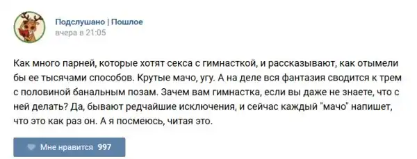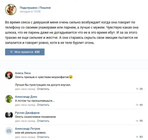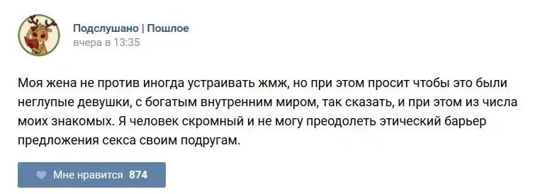 У каждого человека есть своя любимая группа или любимое сообщество в какой-либо социальной сети. Иногда это группа не совсем приличная, поэтому нет возможности в открытом режиме подписаться на неё и прочитывать свежие посты. Мы предлагаем вам очередную порцию из серии интересных постов в группе «Подслушано пошлое». Сегодняшняя запись: Подслушано пошлое предлагает посмотреть несколько интересных и запоминающихся постов, вместе с комментариями из данной группы в социальной сети ВКонтакте.
