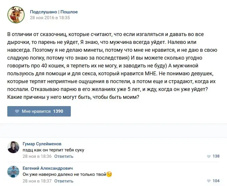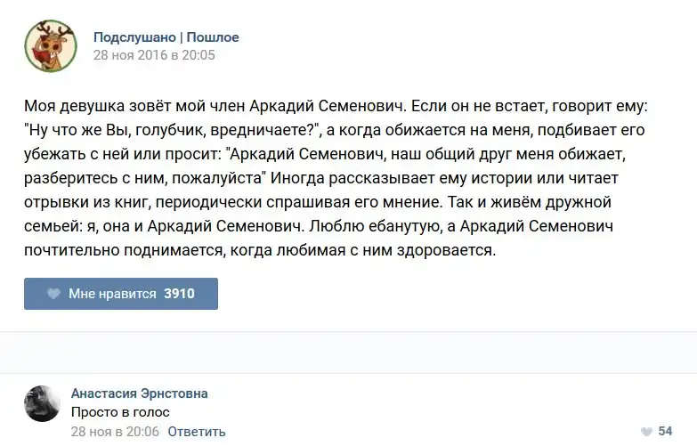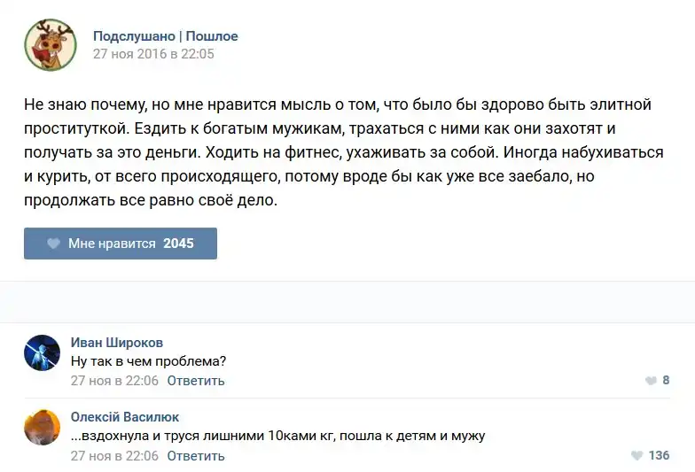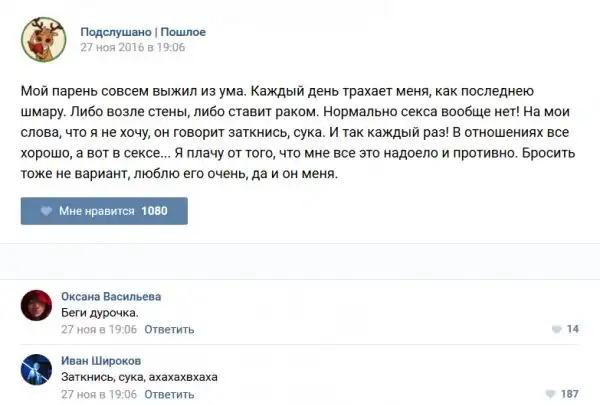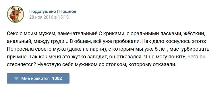 У каждого человека есть своя любимая группа или любимое сообщество в какой-либо социальной сети. Иногда это группа не совсем приличная, поэтому нет возможности в открытом режиме подписаться на неё и прочитывать свежие посты. Мы предлагаем вам очередную порцию из серии интересных постов в группе «Подслушано пошлое». Сегодняшняя запись: Подслушано пошлое предлагает посмотреть несколько интересных и запоминающихся постов, вместе с комментариями из данной группы в социальной сети ВКонтакте.