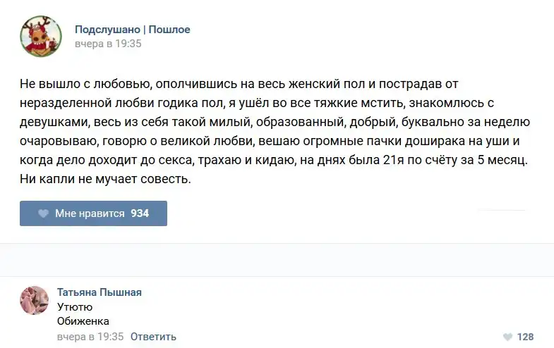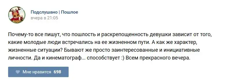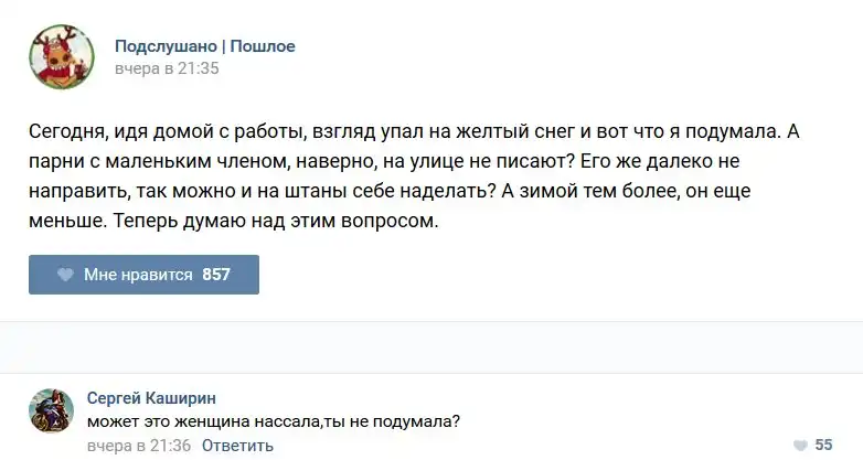 У каждого человека есть своя любимая группа или любимое сообщество в какой-либо социальной сети. Иногда это группа не совсем приличная, поэтому нет возможности в открытом режиме подписаться на неё и прочитывать свежие посты. Мы предлагаем вам очередную порцию из серии интересных постов в группе «Подслушано пошлое». Сегодняшняя запись: Подслушано пошлое предлагает посмотреть несколько интересных и запоминающихся постов, вместе с комментариями из данной группы в социальной сети ВКонтакте.