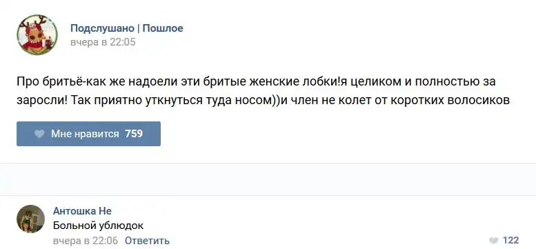 Да что ж всем покоя не дает степень оволосения лобка? Это личное дело каждой женщины и ее мужчины. Зачем к другим людям в трусы лезть да еще и называть извращенцами, если их представление о сексуальности не совпадает с вашим?