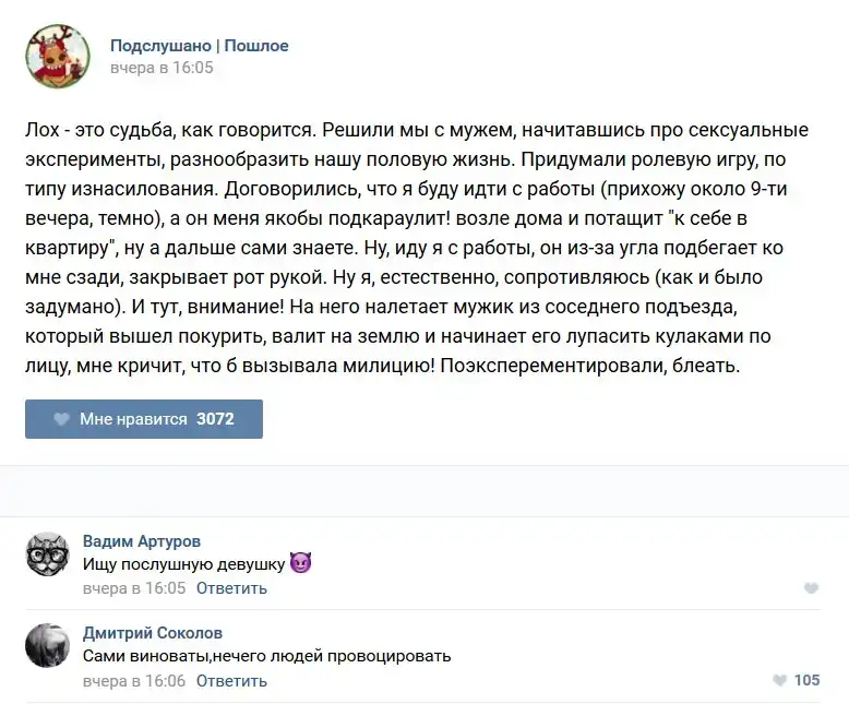У каждого человека есть своя любимая группа или любимое сообщество в какой-либо социальной сети. Иногда это группа не совсем приличная, поэтому нет возможности в открытом режиме подписаться на неё и прочитывать свежие посты. Мы предлагаем вам очередную порцию из серии интересных постов в группе «Подслушано пошлое». Сегодняшняя запись: Подслушано пошлое предлагает посмотреть несколько интересных и запоминающихся постов, вместе с комментариями из данной группы в социальной сети ВКонтакте.