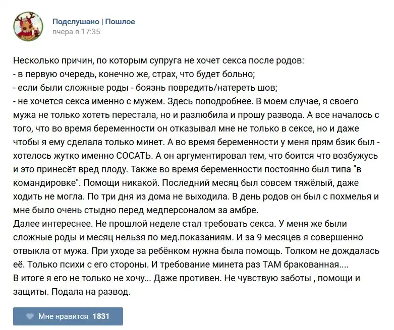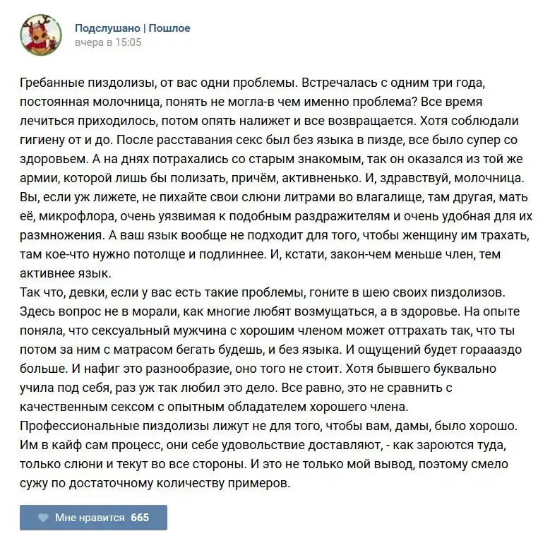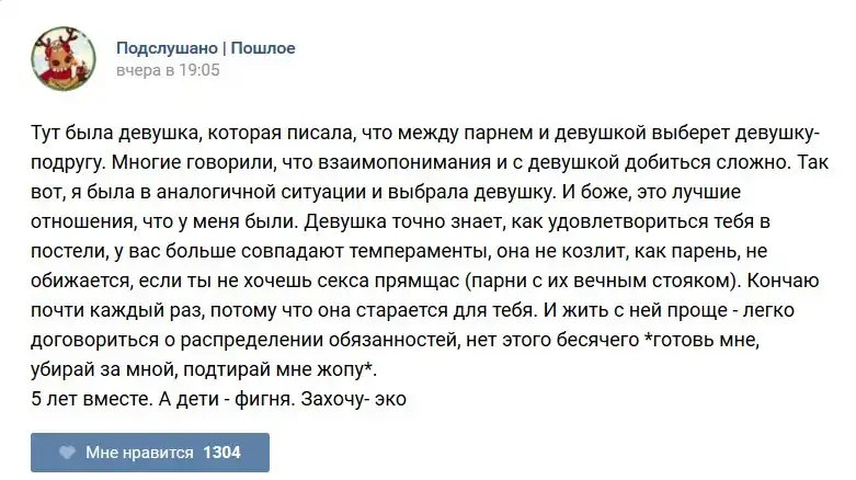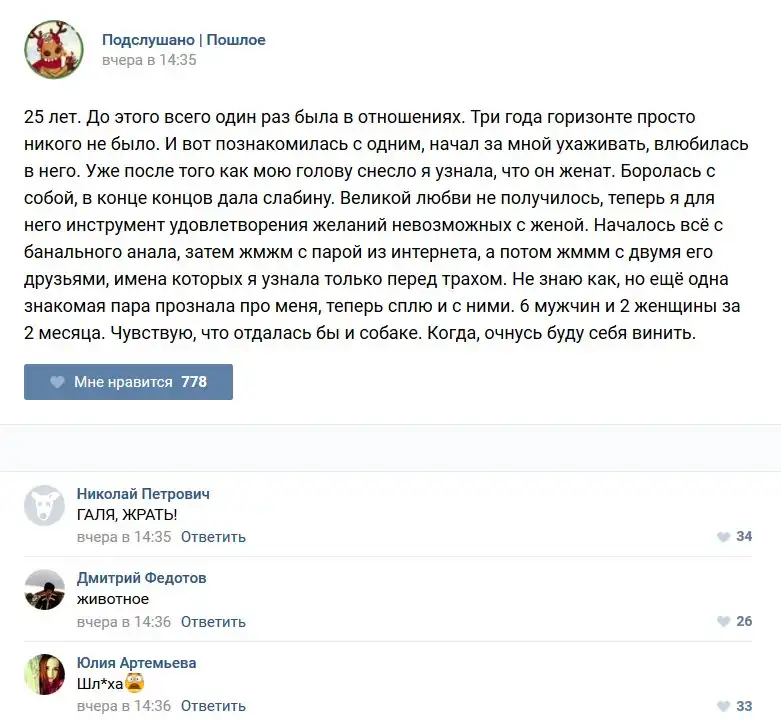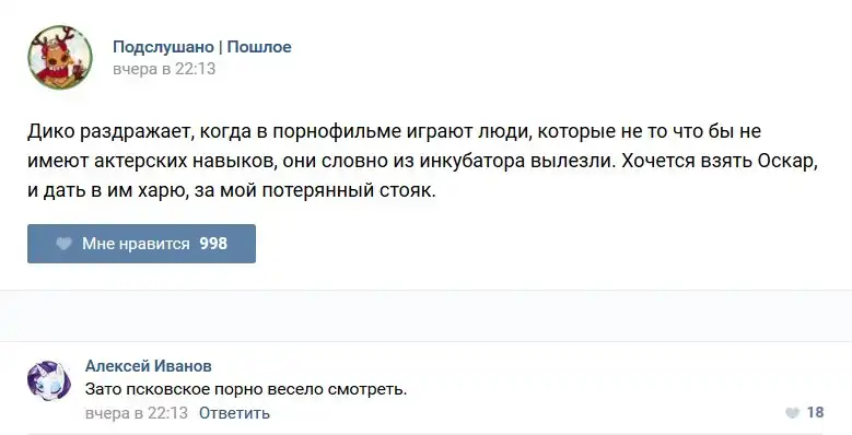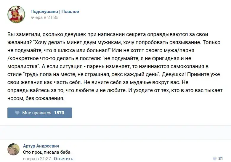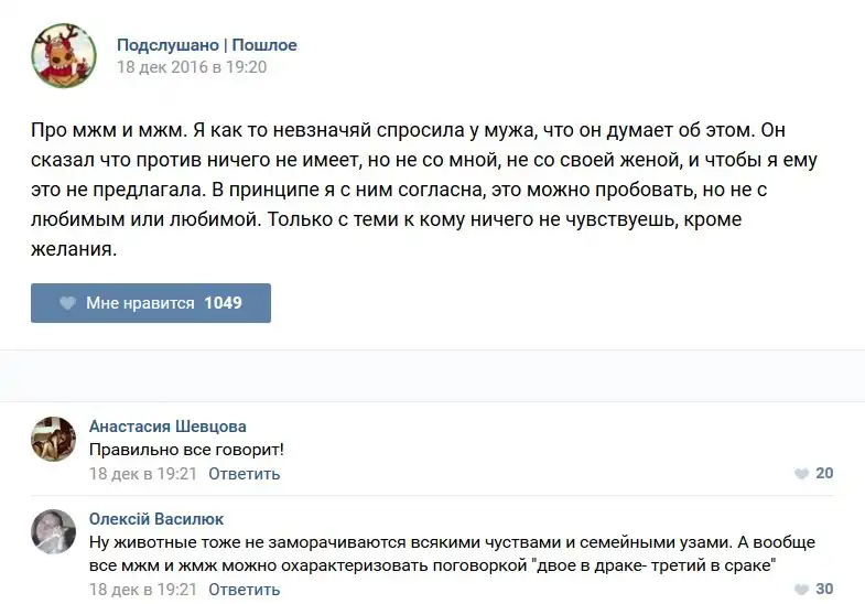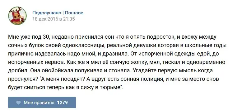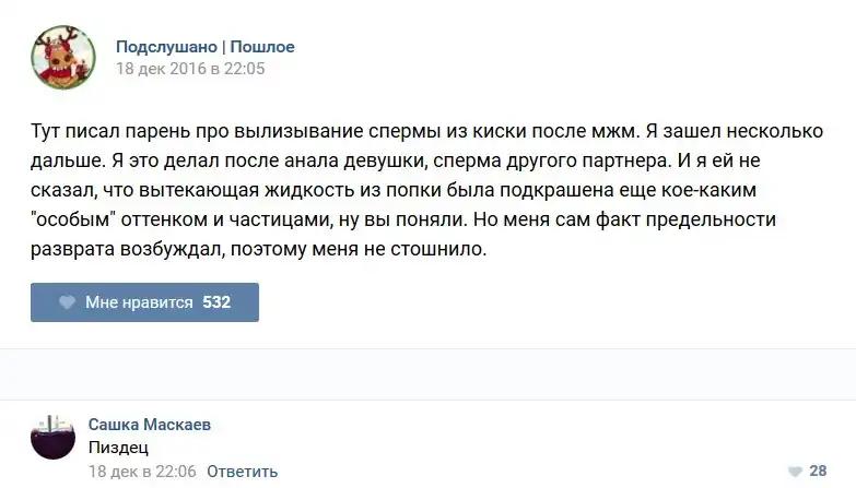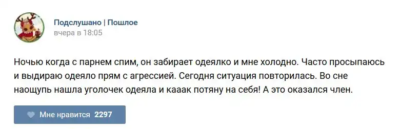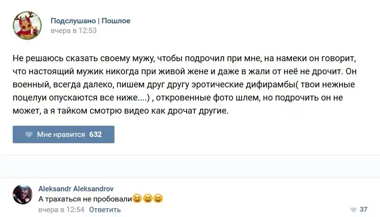 У каждого человека есть своя любимая группа или любимое сообщество в какой-либо социальной сети. Иногда это группа не совсем приличная, поэтому нет возможности в открытом режиме подписаться на неё и прочитывать свежие посты. Мы предлагаем вам очередную порцию из серии интересных постов в группе «Подслушано пошлое». Сегодняшняя запись: Подслушано пошлое предлагает посмотреть несколько интересных и запоминающихся постов, вместе с комментариями из данной группы в социальной сети ВКонтакте.