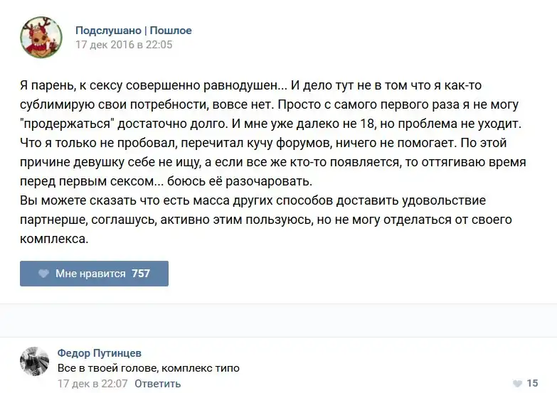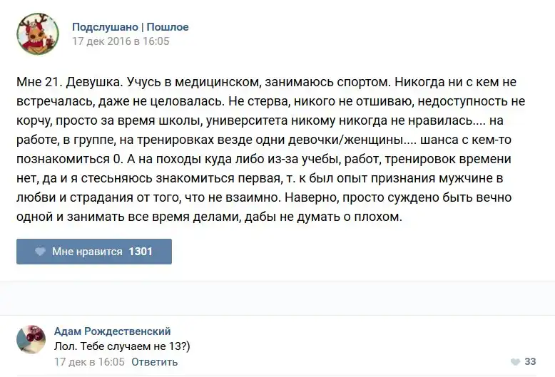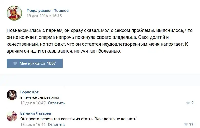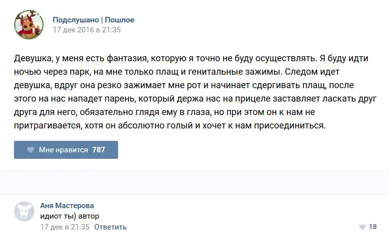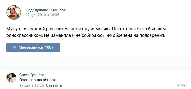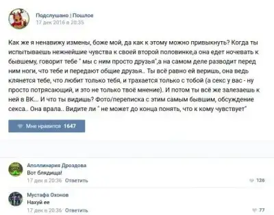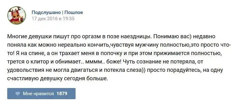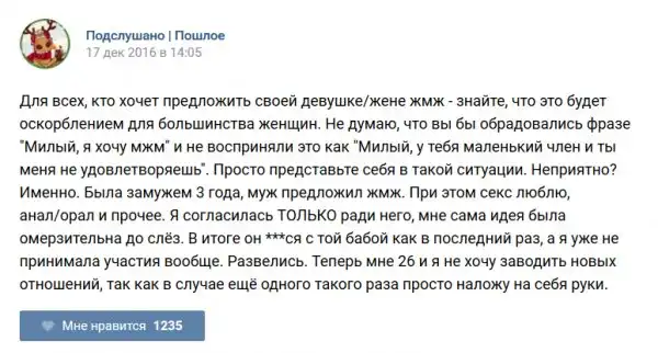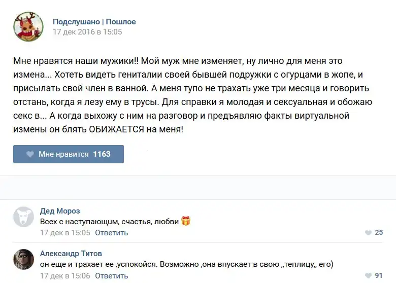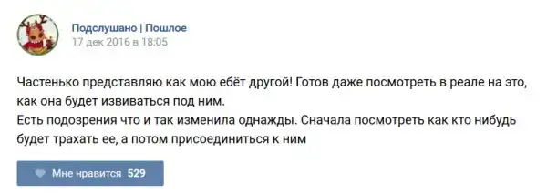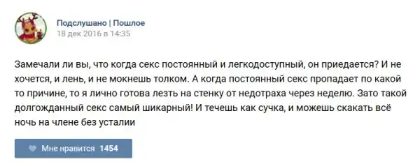 У каждого человека есть своя любимая группа или любимое сообщество в какой-либо социальной сети. Иногда это группа не совсем приличная, поэтому нет возможности в открытом режиме подписаться на неё и прочитывать свежие посты. Мы предлагаем вам очередную порцию из серии интересных постов в группе «Подслушано пошлое». Сегодняшняя запись: Подслушано пошлое предлагает посмотреть несколько интересных и запоминающихся постов, вместе с комментариями из данной группы в социальной сети ВКонтакте.