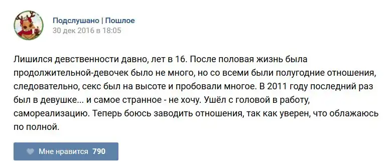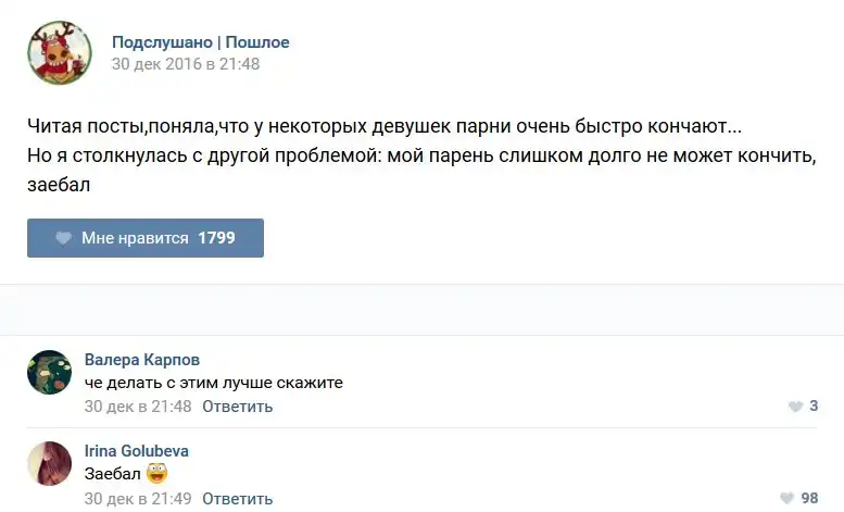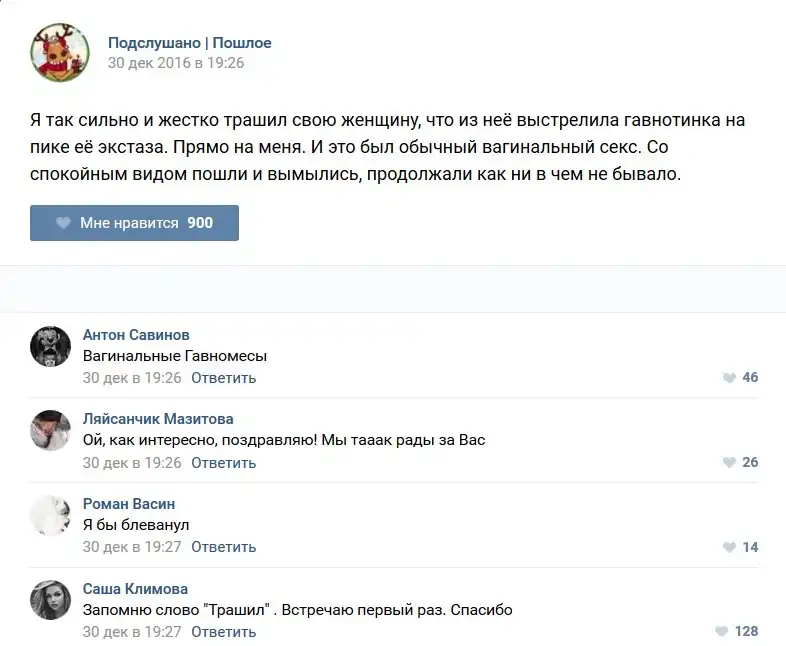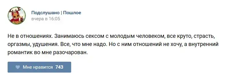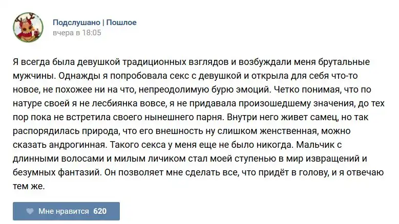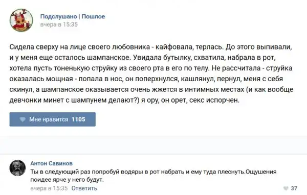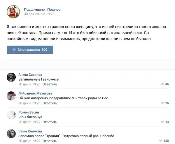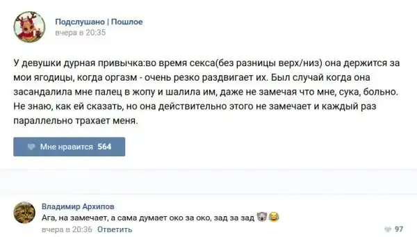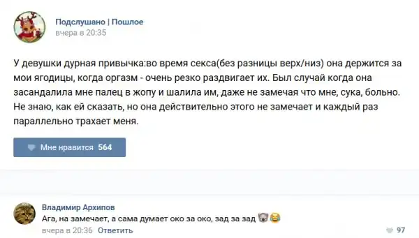 У каждого человека есть своя любимая группа или любимое сообщество в какой-либо социальной сети. Иногда это группа не совсем приличная, поэтому нет возможности в открытом режиме подписаться на неё и прочитывать свежие посты. Мы предлагаем вам очередную порцию из серии интересных постов в группе «Подслушано пошлое». Сегодняшняя запись: Подслушано пошлое предлагает посмотреть несколько интересных и запоминающихся постов, вместе с комментариями из данной группы в социальной сети ВКонтакте.