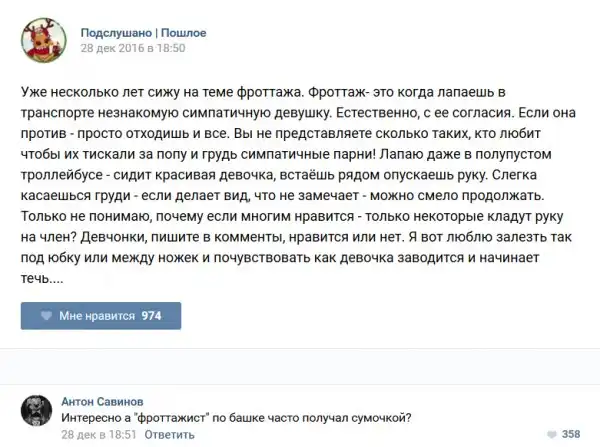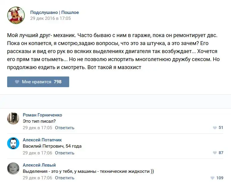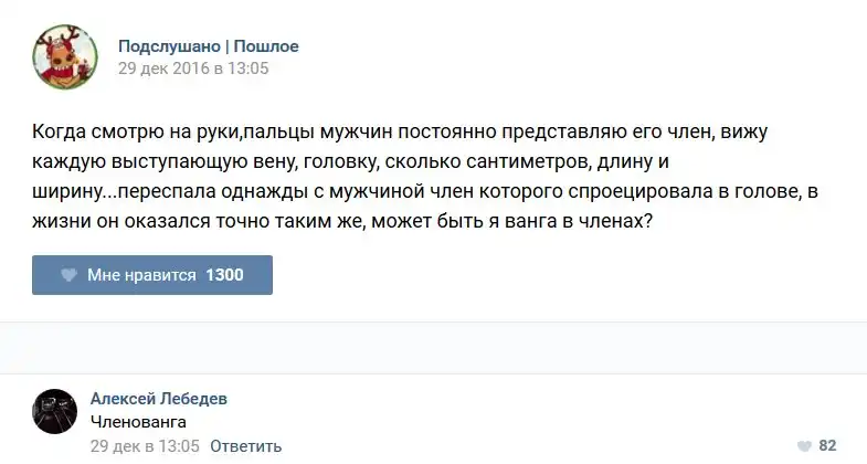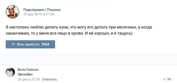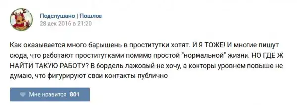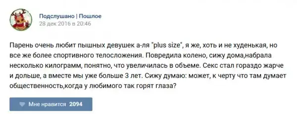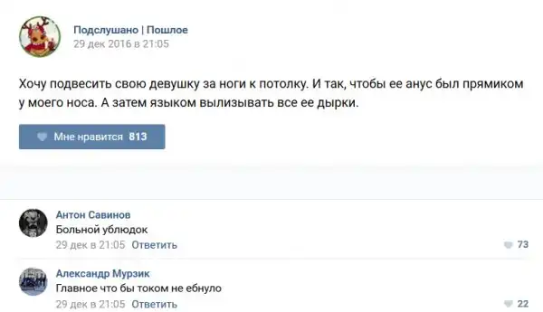 У каждого человека есть своя любимая группа или любимое сообщество в какой-либо социальной сети. Иногда это группа не совсем приличная, поэтому нет возможности в открытом режиме подписаться на неё и прочитывать свежие посты. Мы предлагаем вам очередную порцию из серии интересных постов в группе «Подслушано пошлое». Сегодняшняя запись: Подслушано пошлое предлагает посмотреть несколько интересных и запоминающихся постов, вместе с комментариями из данной группы в социальной сети ВКонтакте.