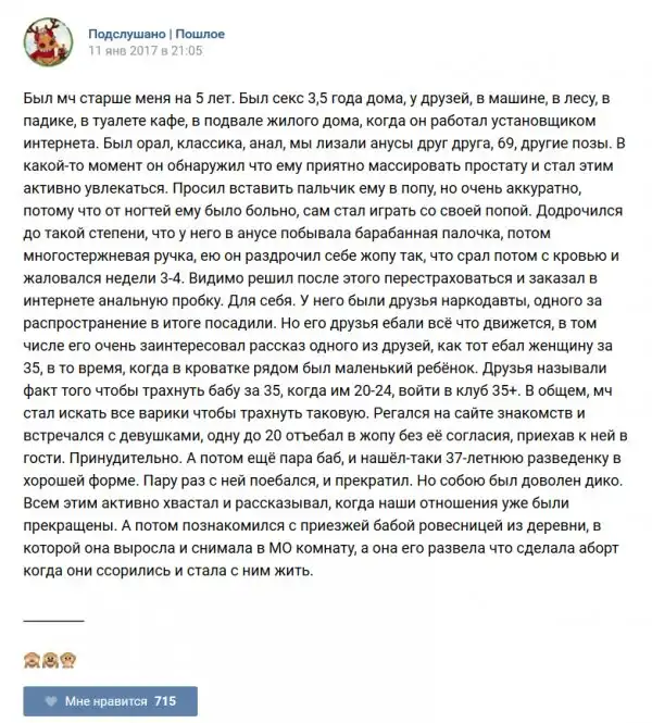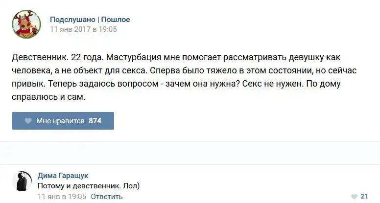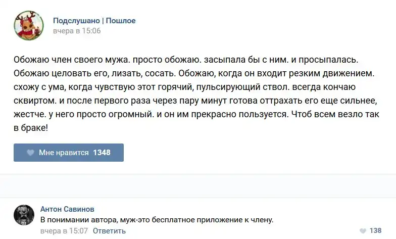 У каждого человека есть своя любимая группа или любимое сообщество в какой-либо социальной сети. Иногда это группа не совсем приличная, поэтому нет возможности в открытом режиме подписаться на неё и прочитывать свежие посты. Мы предлагаем вам очередную порцию из серии интересных постов в группе «Подслушано пошлое». Сегодняшняя запись: Подслушано пошлое (25 фото) предлагает посмотреть несколько интересных и запоминающихся постов, вместе с комментариями из данной группы в социальной сети ВКонтакте.
