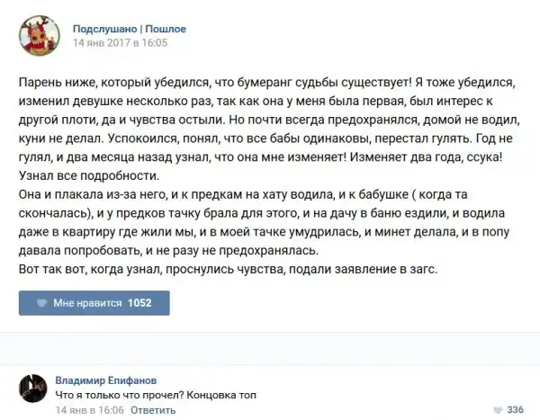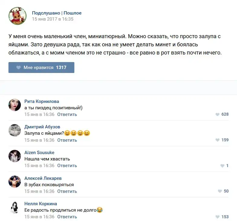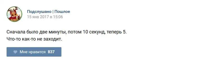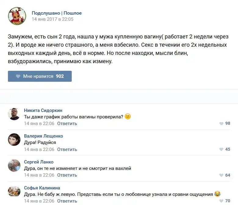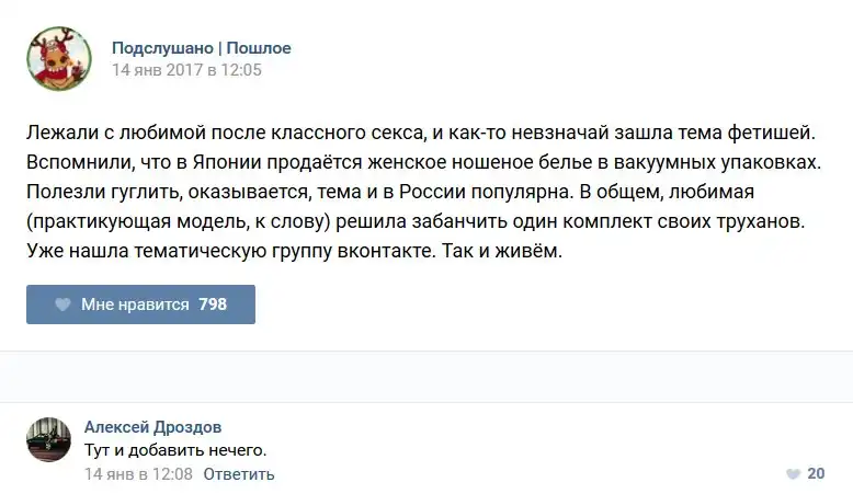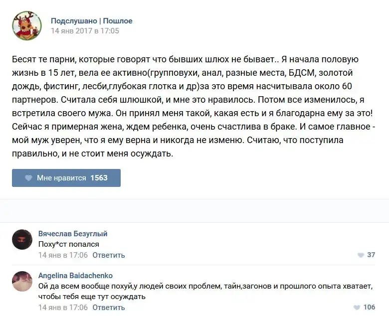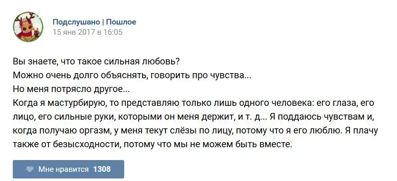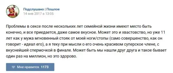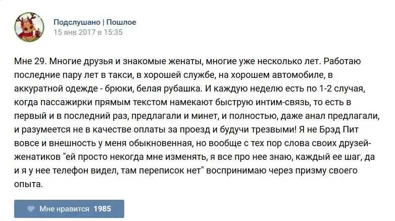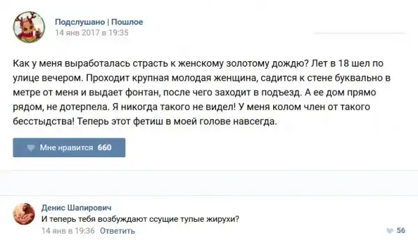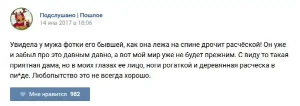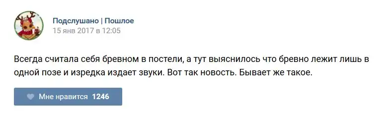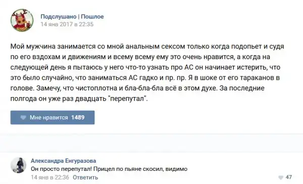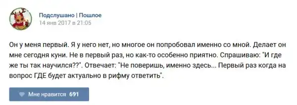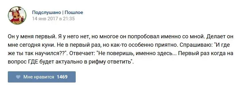 У каждого человека есть своя любимая группа или любимое сообщество в какой-либо социальной сети. Иногда это группа не совсем приличная, поэтому нет возможности в открытом режиме подписаться на неё и прочитывать свежие посты. Мы предлагаем вам очередную порцию из серии интересных постов в группе «Подслушано пошлое». Сегодняшняя запись: Подслушано пошлое (25 фото) предлагает посмотреть несколько интересных и запоминающихся постов, вместе с комментариями из данной группы в социальной сети ВКонтакте.