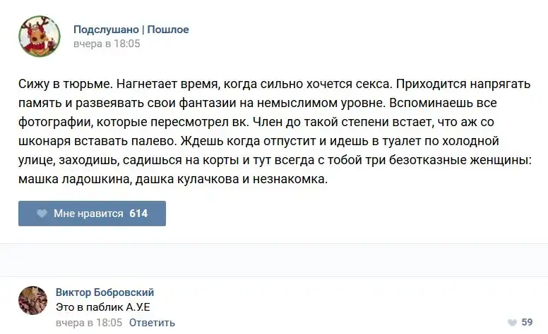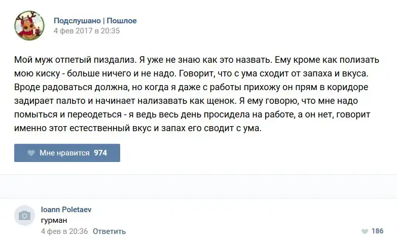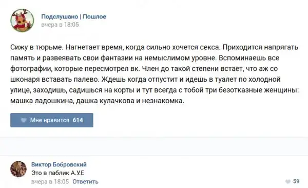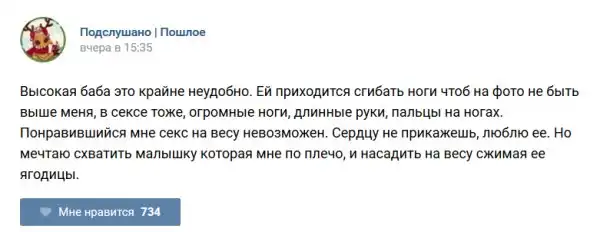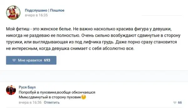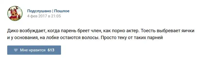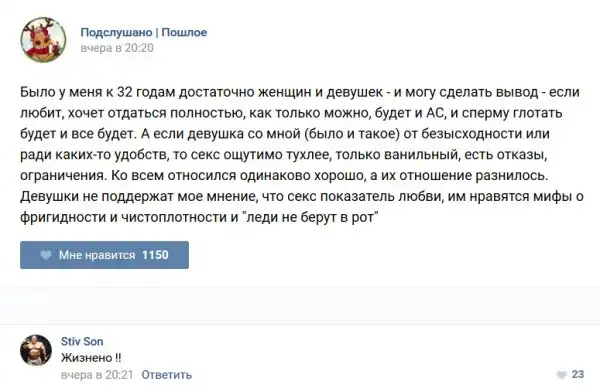 У каждого человека есть своя любимая группа или любимое сообщество в какой-либо социальной сети. Иногда это группа не совсем приличная, поэтому нет возможности в открытом режиме подписаться на неё и прочитывать свежие посты. Мы предлагаем вам очередную порцию из серии интересных постов в группе «Подслушано пошлое». Сегодняшняя запись: Подслушано пошлое (25 фото) предлагает посмотреть несколько интересных и запоминающихся постов, вместе с комментариями из данной группы в социальной сети ВКонтакте.