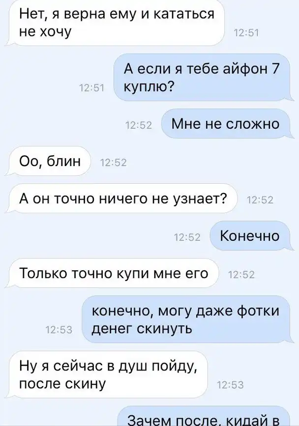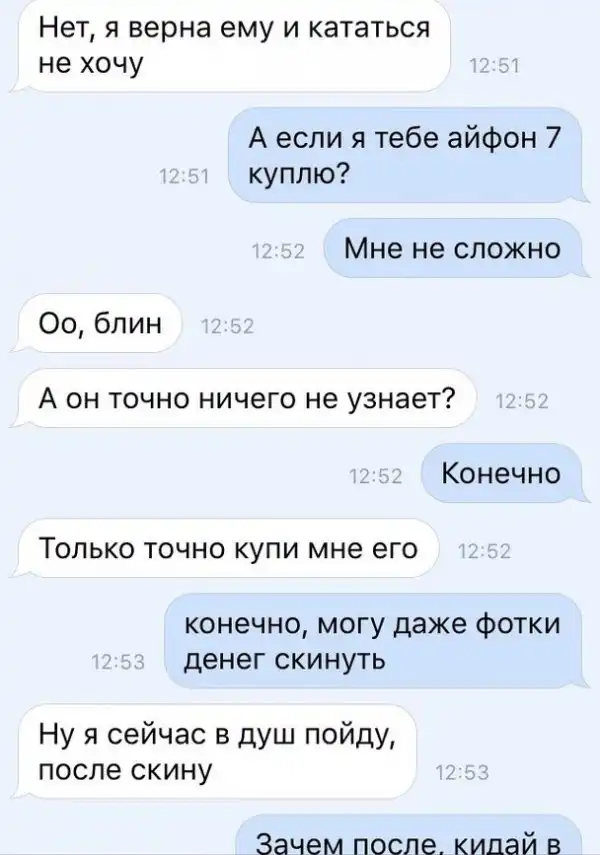 Друзья, смотрю тут переписки давно и удивлялся тем, кто в это верит. До тех пор, пока сам не столкнулся с этим. Захотел проверить "возлюбленную". Целый год вместе были, вместе прошли многое, хотел сделать предложение осенью, даже кольцо уже выбрал. Жили мы только не вместе, но это мелочи.