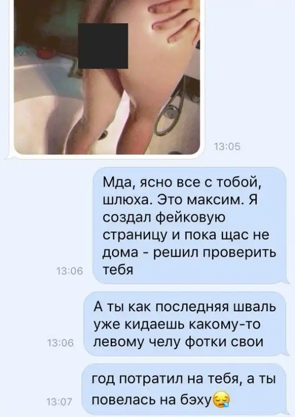 Саня (одноклассник) рассказал, что лучше проверить будущую супругу .Сделал я фейковый аккаунт по его наставлениям, и понеслась .Рыдаю сейчас, слов подобрать не могу, лишился семьи, когда мне не было и 12, карьеру построил с нуля сам, думал, что она самый дорогой в мире человек. Чтоб тебя в аду черти жарили, шкура.