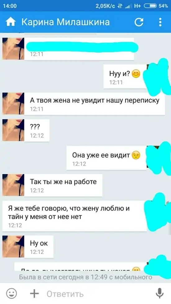 Недавно мы рассказывали вам о разводе с бесплатным велосипедом, а сегодня хотели бы рассказать о еще одном способе вымогательства, на который довольно часто попадаются женатые мужчины. Девушка пытается втереться в доверие к женатому мужчине, а затем требует от него денег, шантажируя скриншотами переписки. Читаем переписку далее, и вам все сразу станет ясно.