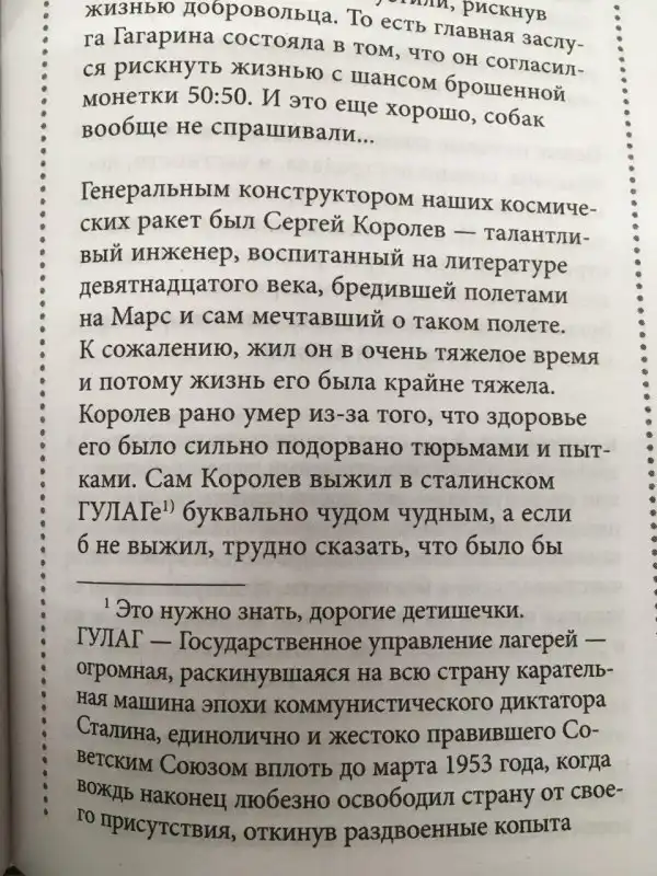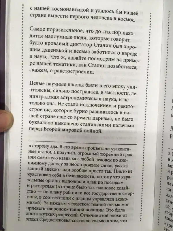 В одной из детских энциклопедий "Астрономия на пальцах" маленьким читателям объясняют устройство космоса, звезд, планет и Вселенной. В разделе про историю отечественной космонавтики начинается странное. Фраза "карательная машина эпохи коммунистического диктатора Сталина, единолично и жестко правившего Советским Союзом вплоть до марта 1953 года, когда вождь наконец любезно освободил страну от своего присутствия, откинув раздвоенные копыта в строну ада" напечатанная в книге, должна мотивировать детей яростней протирать телескопы, вглядываясь в небесные светила? Зачем нужен этот поток желчи в детской литературе?