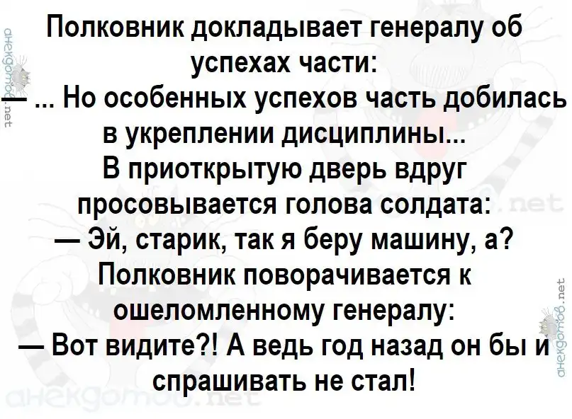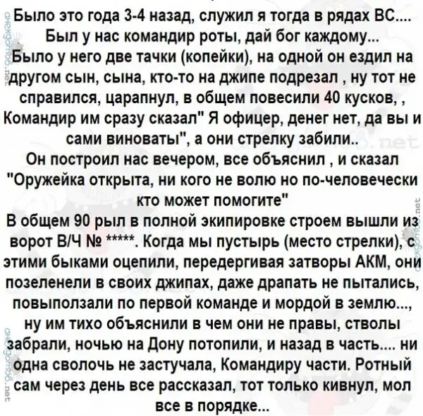 В 94 г. МО имело долги за всё. За свет не платили. Приехали электрики и отключили подстанцию на военный городок. Солдаты умельцы восстановили энергоснабжение. Электрики опять отключили. Парни снова подключились. Во избежание эксцессов командир части на построении попросил солдат-срочников организовать охрану подстанции. Не приказал, а попросил желающих. Распорядился выдать шесть автоматов и по одному магазину с патронами. Годки скупили китайские говорящие будильники и сами ночью вставали и меняли парней на подстанции. Дежурному по роте категорически было запрещено будить такую охрану. И так полтора месяца. Автоматы передавались из рук в руки, без всяких росписей в журнале выдачи оружия в оружейке. Потом вопрос решился и всё вернули. Ни один патрон не пропал. Полк был на боевом дежурстве, ворота Дальнего востока. За время стояния, ни один сука генерал ни приехал в часть. Все кто стоял в оцеплении на два месяца раньше домой уехали и все с сержантскими лычками!
