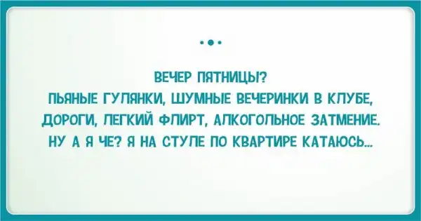 Неужели могут быть люди, которые не ждут пятницы с нетерпением? Если только те, кому в субботу работать... Для остальных же этот заветный день - уже первый в череде долгожданных выходных, когда можно наконец оторваться на всю катушку!