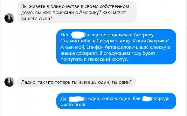 После этого разговор закончился. Возможно, капитану армии нужен был день на фильтрацию информации про дойку моржей и предложение «работы» его мертвой жене. Но все же потом диалог продолжился.