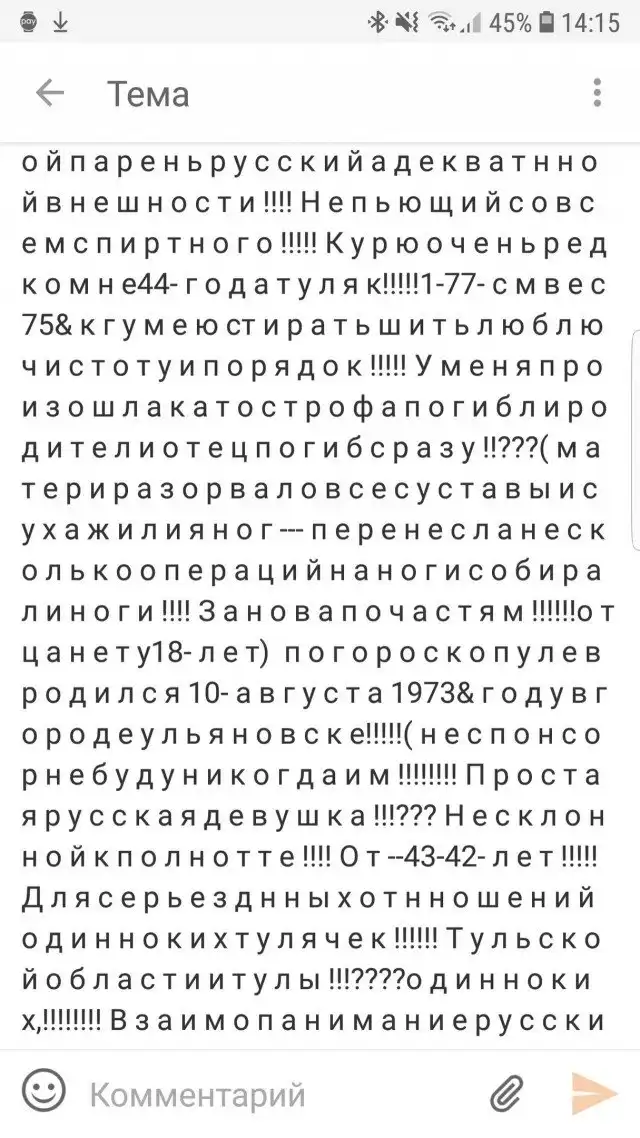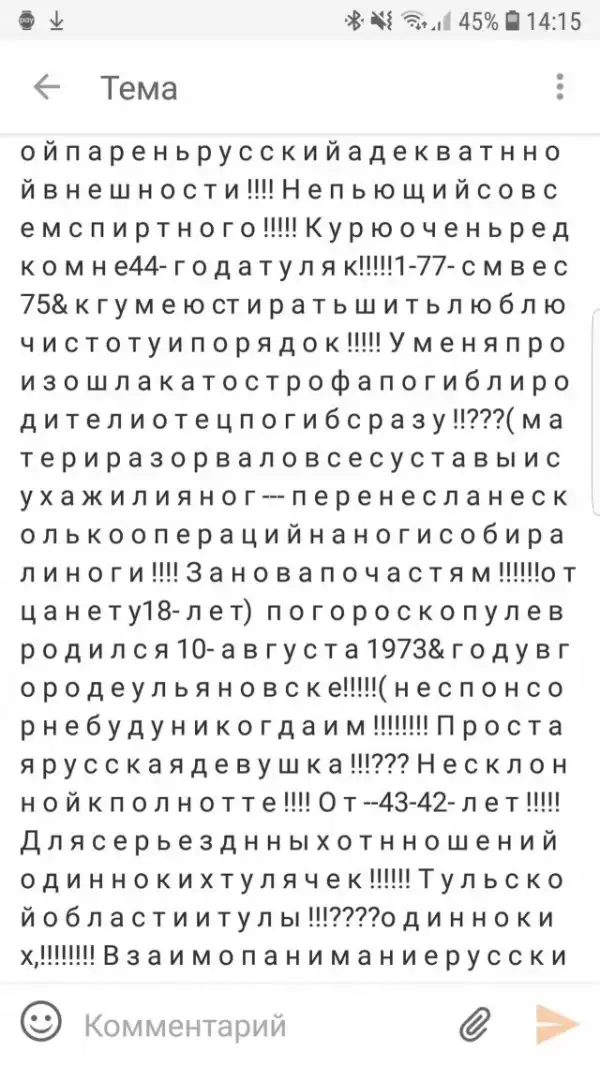 Парень из Тулы дает мастер-класс в поисках терпеливых женщин. Секрет прост - свое сообщение нужно писать с пробелами после каждого символа, не разделяя слова и предложения. В результате, читать получивший текст - сплошная пытка. Осилить его может, поистине, только очень терпеливый человек. Но может именно такая спутница ему и нужна?