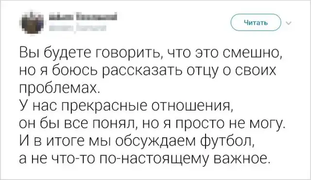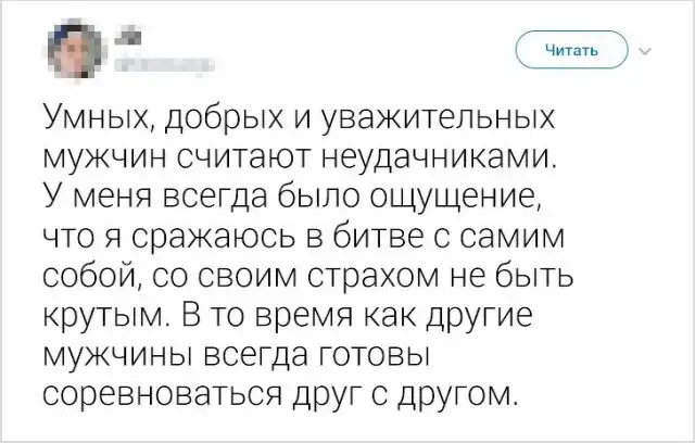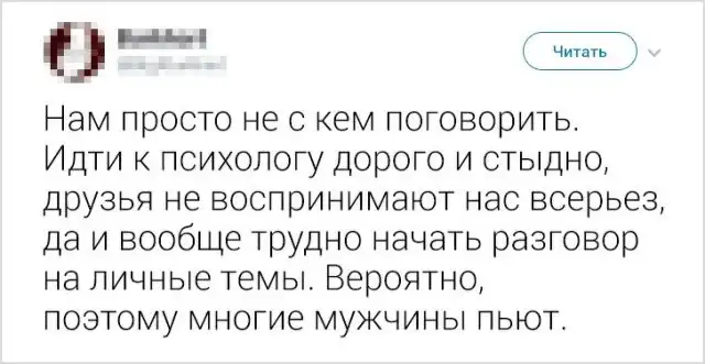 Ни для кого не секрет, что общество довольно многое требует от женщин, которые должны ухаживать за своим внешним видом, воспитывать детей, а еще и строить карьеру, если это возможно. Но ведь и на мужчин также оказывается социальное давление. Известная английская писательница Кейтлин Моран попросила своих подписчиков в Twitter рассказать о проблемах мужчин, которые стали охотно делиться своими историями. Предлагаем вам почитать некоторые из них далее.