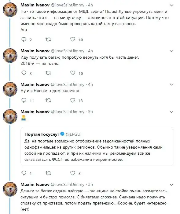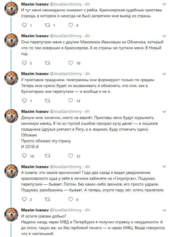 Бывший главный редактор «Канобу» и редактор «Шапито» на «Медузе» Максим Иванов рассказал о том, как его не выпустили из России в Ригу. По его словам, у судебных приставов возникли претензии к его однофамильцу из Красноярска.