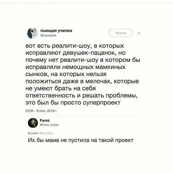 Из этого поста вы узнаете, до чего доводит чрезмерная материнская любовь и забота. Понятно одно - возлюбленные маменькиных сынков конкретно влипли, а спасти их может только чудо.