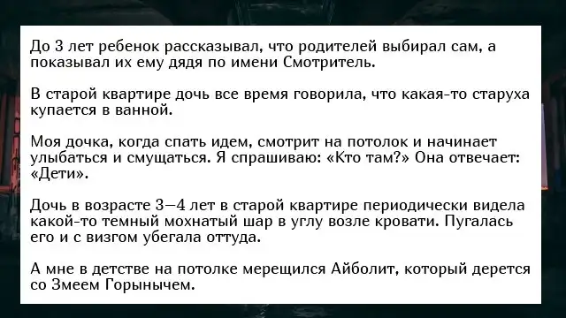 Бывало ли у вас такое, что ваш кот неподвижно сидит на одном месте и смотрит в одну точку, а затем начинает пятиться назад, как будто он что-то или кого-то увидел? К сожалению, животные не могут нам рассказать о том, что они видят, чего не скажешь о детишках, чьи рассказы порой леденят кровь. Хотите почитать такие истории? Тогда обязательно читаем.