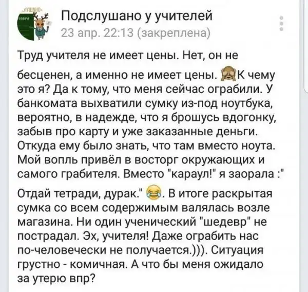 Учитель - это когда тебя даже ограбить не могут по-человечески
