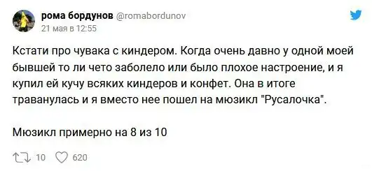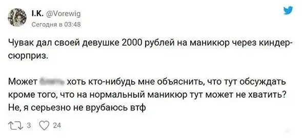 На днях один пользователь Twitter выложил фотографию, показывающую, как он решил порадовать свою девушку. Его возлюбленная сломала ноготь, а он купил обычный "Киндер-сюрприз", аккуратно вскрыл его и вложил в капсулу 2 тысячи рублей. Затем он упаковал все обратно и подарил. И вроде бы ничего необычного, но эта история вызвала целую бурю комментариев.