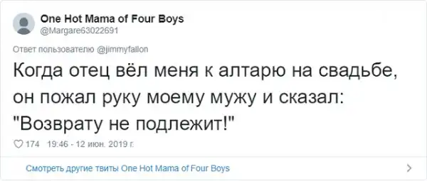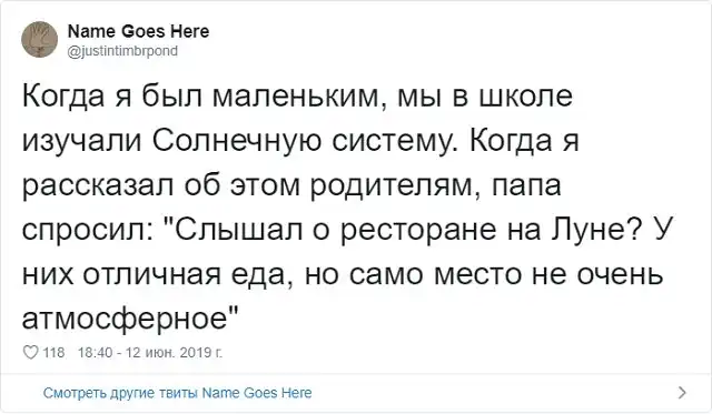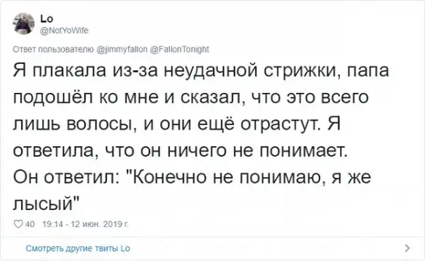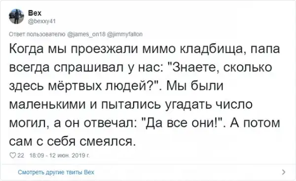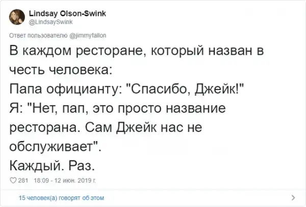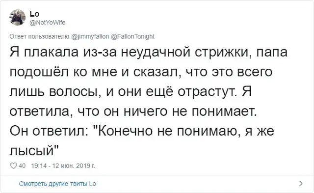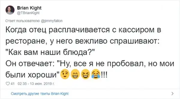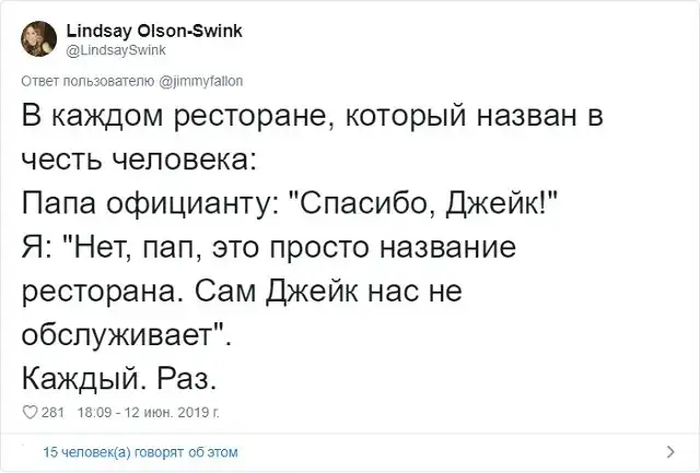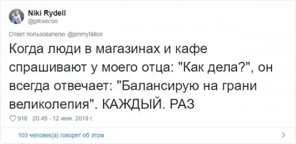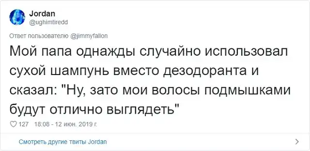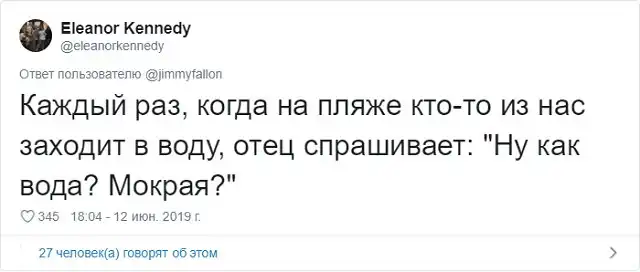 Знаменитый американский ведущий Джимми Фэллон решил запустить забавный флешмоб в соцсети. Он попросил своих подписчиков поделиться самыми смешными шутками своих отцов, которые они без конца повторяют. Как известно, отцовские шуточки - это уникальный подвид юмора, который возникает только, когда у тебя появляются дети. Любой другой человек, не имеющий детишек, не способен генерировать юмор такой категории.