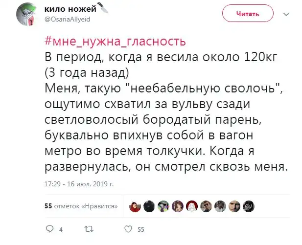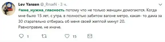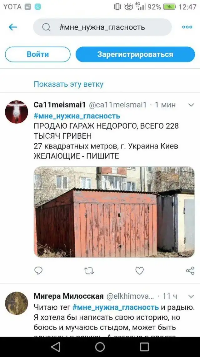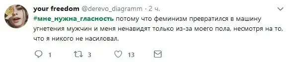 В Твиттере по хеш-тегу #мне_нужна_гласность прямо сейчас проходит флешмоб феминисток. Девушки делятся историям, унизившими и поразившими их до глубины души. Парни быстро подсуетились и стали под этим тэгом продавать гаражи и рассказывать о домогательствах со стороны престарелых теток. В общем, новый веселый тренд.