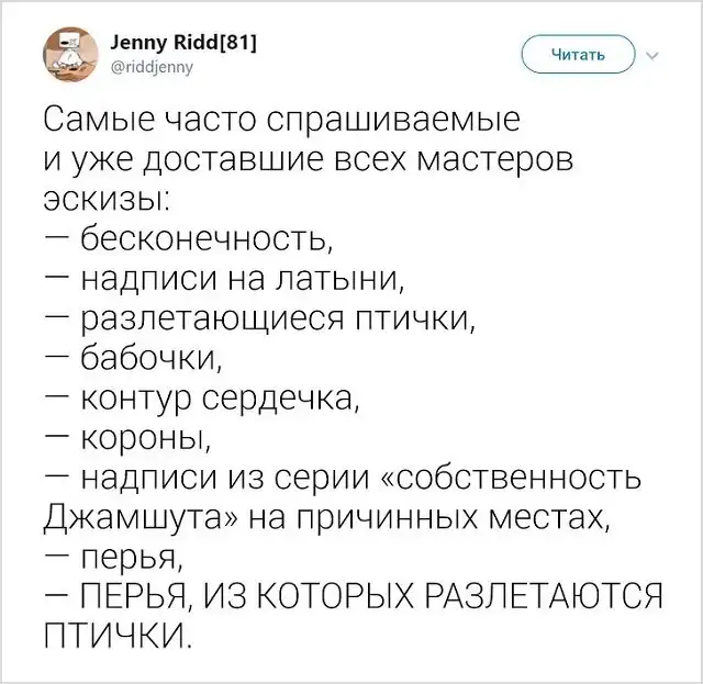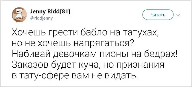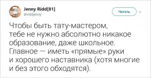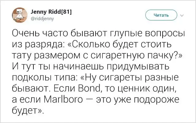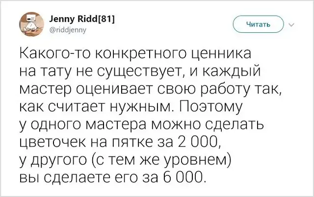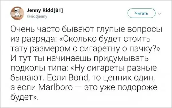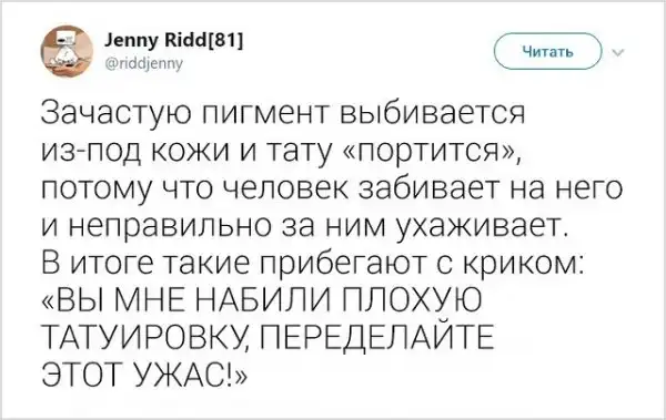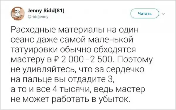Татуировки в течение долгих лет являются предметом спора. Одна половина считает, что тату - это искусство и отличное украшение, а вторая уверена, что краска под кожей - это осквернение тела. Но большинство из них объединяет один момент - они совсем ничего не знают о работе тату-мастеров. Художница, которая работает в тату-салоне в Челябинска решила рассказать о своей профессии твиттере. За долгое время работы татуировщицей у нее накопилось много любопытных наблюдений и историй.