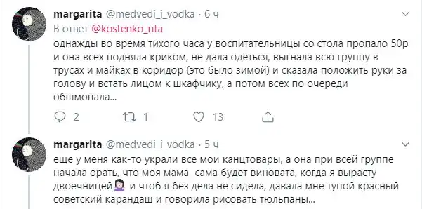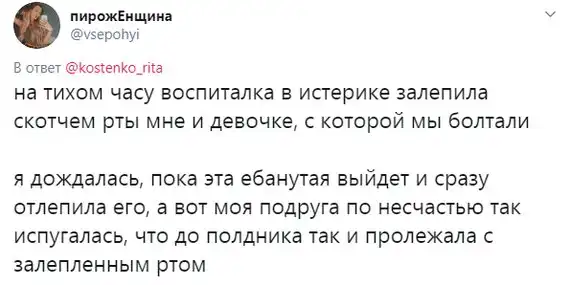 В Твиттере кто-то кинул клич и предложил вспомнить, какие идиотские наказания для теперь уже взрослых людей придумывали воспитательницы и нянечки в детском саду. И там такое вспомнили – дыбом волосы )))