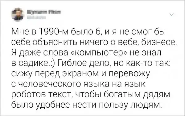Артем Штанов, работающий фотографом и диджеем, запустил довольно забавный флешмоб. Он предложил пользователям твиттера рассказать о своей работе, но с одним с условием - объяснение должно выглядеть так, чтобы у 6-летнего ребенка не возникло никаких вопросов. В итоге получилось довольно забавно.