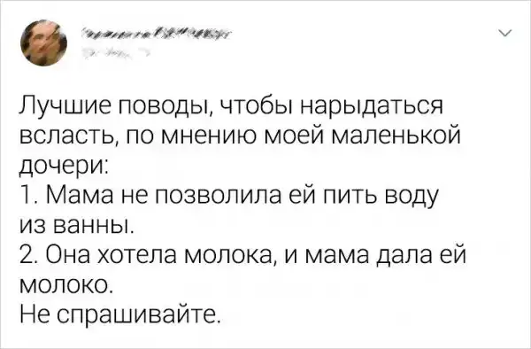 Капризные детки всегда найдут повод поплакать. То вода ванной слишком мокрая, то на ночь поцеловали не 5 раз, как всегда было принято, а 4! Молодой папа с ником "HenpeckedHal" решил поведать пользователям соцсетей о своем маленьком любителе "порыдать". Так начался небольшой флешмоб, в котором родители также захотели поделиться мини-историями о своих детях.