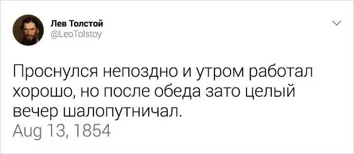 Хоть и Лев Николаевич Толстой носил холщовую рубаху и лапти, а также не стеснялся работать по хозяйству в своем имении вместе с крестьянами, граф был тот еще "светский лев". Он выписывал себе заморскую прессу, встречался со знаменитыми современниками и часто принимал гостей. Интересно, как бы выглядел Twitter-аккаунт мастодонта русской литературы? Писателя знали во всем мире и наверняка бы у него было много подписчиков. В эксперименте использованы записи из личных дневников Толстого.