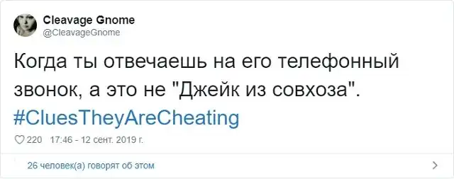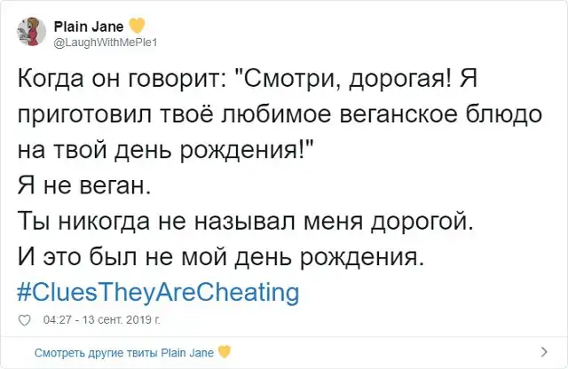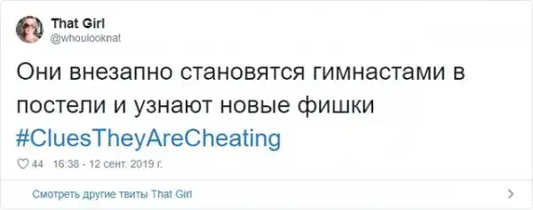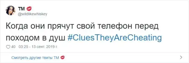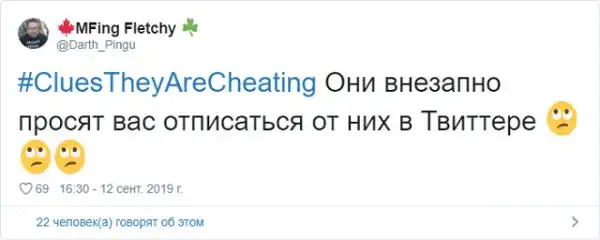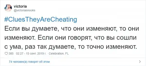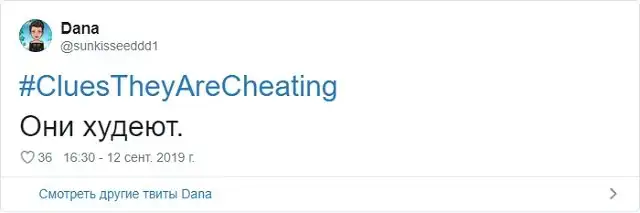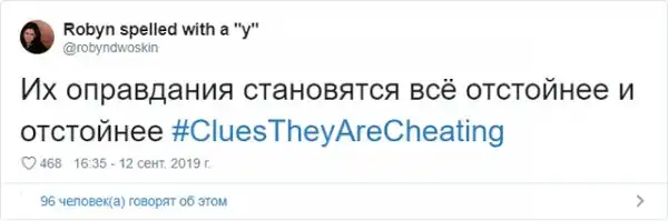 Пожалуй, самая неприятная ситуация, которая может случится в отношениях - это измена. Это максимально болезненно как для парней, так и для девушек. Поэтому в Твиттере стартовал флешмоб с хэштегом #CluesTheyAreCheating (доказательства того, что они изменяют). В нем пользователи в шуточной форме рассказывают, как найти улики и зацепки, которые сигнализируют о том, что вторая половинка явно что-то скрывает.