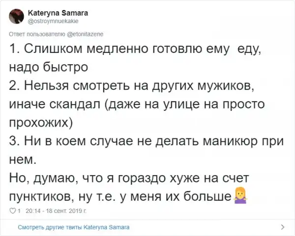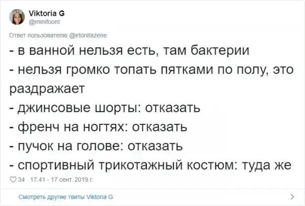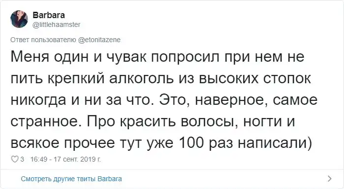 В Интернете девушки устроили новый флешмоб - все делятся странными требованиями, которые предъявляют парни. Началось всё с одного поста в Твиттере, однако идею быстро подхватили. Кто-то из парней просит не красить ногти в тёмный цвет, некоторые запрещают кушать в ванной из-за бактерий... В общем, в этой подборке собран ряд действительно странных требований и претензий.