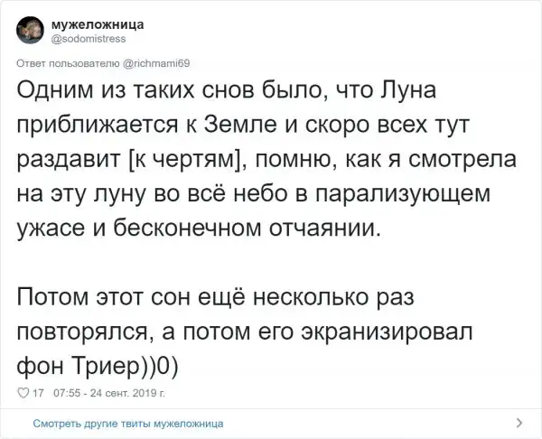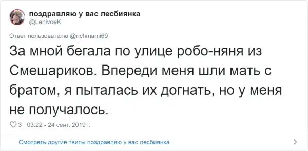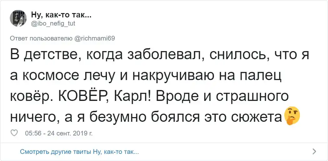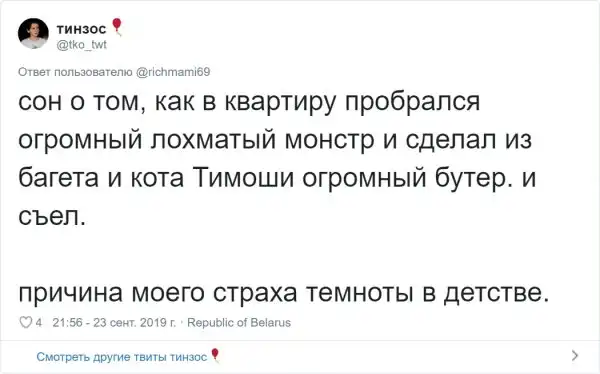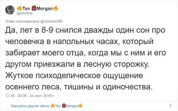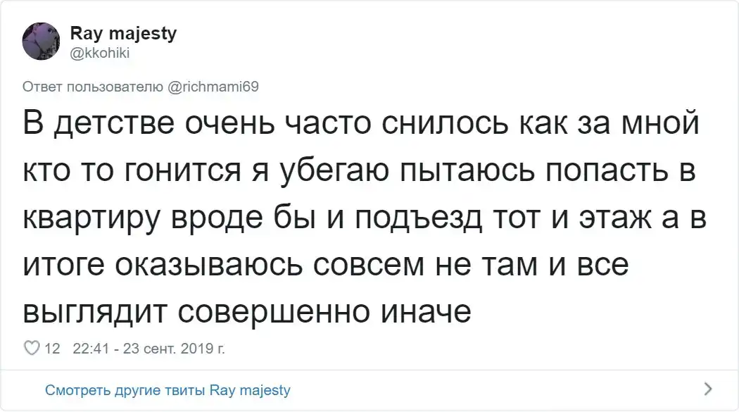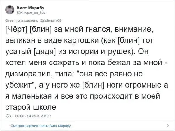 Детское воображение способно на многое. Мало ли какие страшилки прячутся в шкафу или под кроватью? К счастью, детки растут и убеждаются, что никаких бабаек там нет... но это относится не ко всем. Порой чрезвычайно бурное воображение нашего мозга может так впечатлить, что один и тот же кошмар может мучить и во взрослой жизни. Так в Твиттере начался небольшой флешмоб, в котором пользователи поделились самыми-самыми жуткими снами из детства.