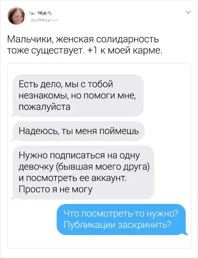 Говорят, что женской дружбы не бывает, но не стоит верить в этот стереотип. Девушки всегда придут на помощь друг другу в любой, даже самой невероятной ситуации. Предлагаем посмотреть подборку забавных твитов и переписок, которые доказывают, что женская солидарность существует.