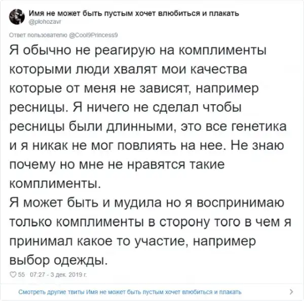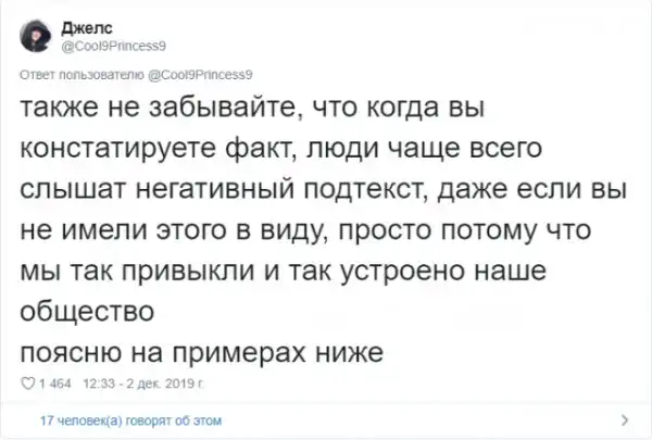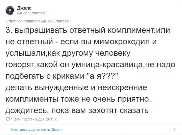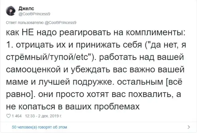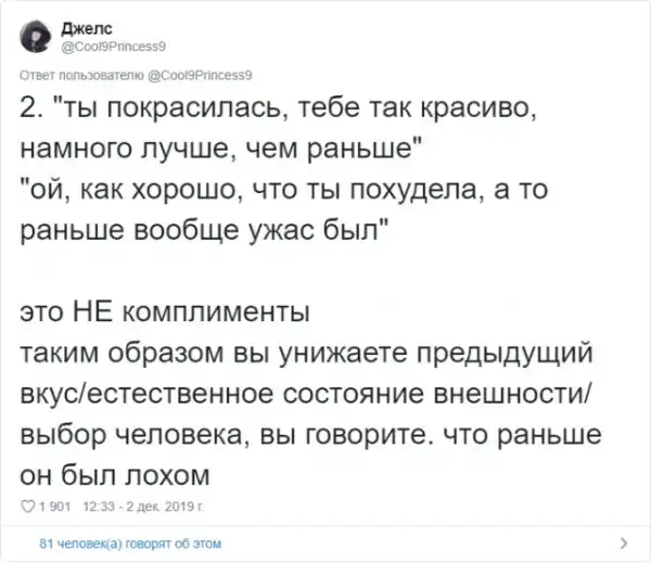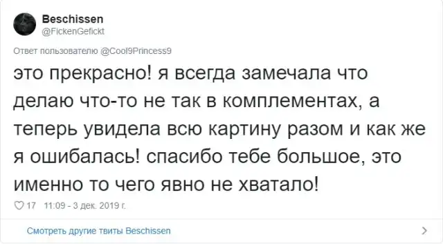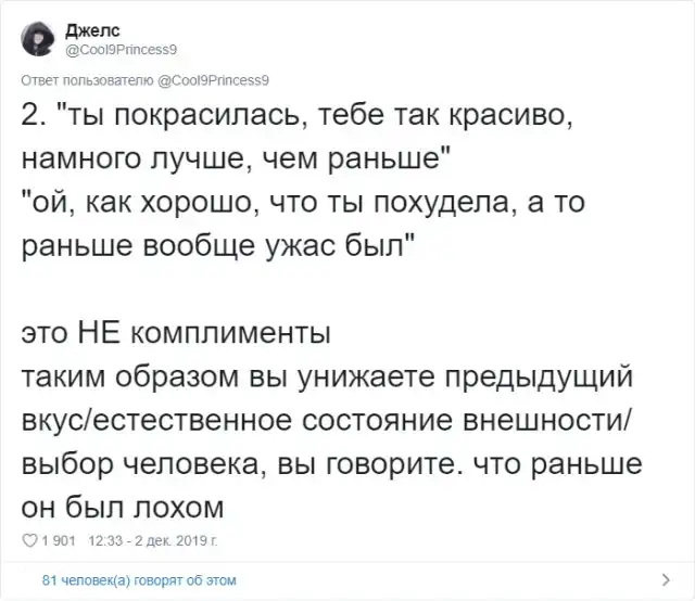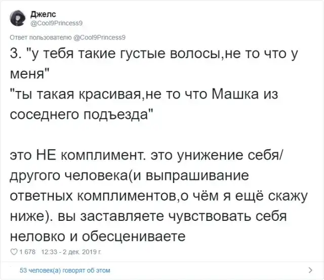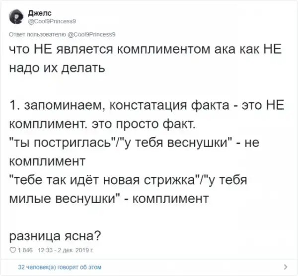 Многие из нас любят получать комплименты. Услышать что-то хорошее в своей адрес - это всегда приятно. Но в действительности, некоторые комплименты звучат крайне сомнительно и могут даже оскорбить человека. Пользовательница Твиттера Джелс создала очень полезный и познавательный тред про комплименты.