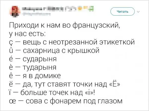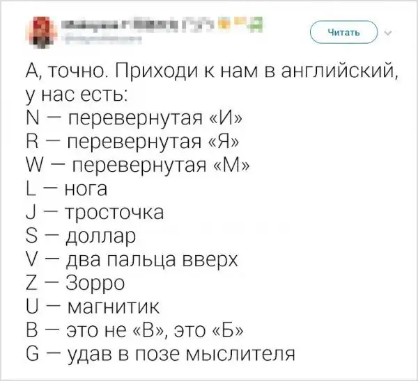 В Твиттере запустили флешмоб, посвященный разным языкам. Особое внимание уделялось буквам, вид которых у представителей другой языковой культуры ассоциируется с чем угодно, но только не с буквами. Давайте посмотрим на этот интересный и забавный флешмоб.