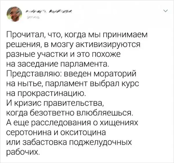 Серьезность - это качество настоящего трудяги и профессионала. Но когда ко всему относишься слишком серьезно, можно заработать нервный срыв. Даже маленькая неприятность, может довести человека до сердечного приступа. Поэтому люди, которые умеют относиться к этому с юмором, всегда будут чувствовать себя лучше тех, кому свойственна звериная серьезность. Давайте посмотрим подборку забавных и самоироничных твитов.