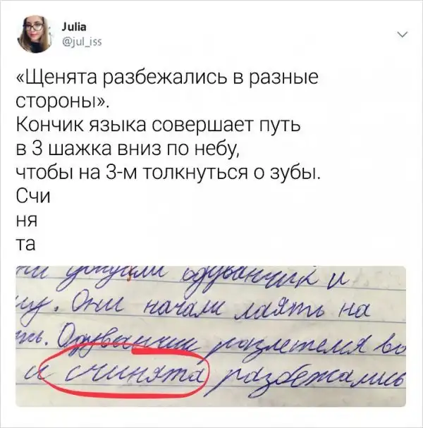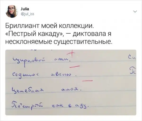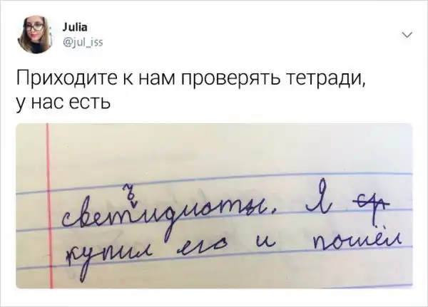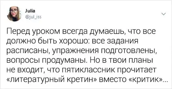 Девушка с ником "Julia" работает преподавателем русского языка и литературы в одной из школ Москвы. Каждый день она наблюдает забавные ситуации и читает смешные перлы от учеников. Она решила рассказать о своих трудовых буднях и запустить "школьный" труд в Твиттере. Давайте посмотрим.