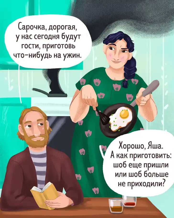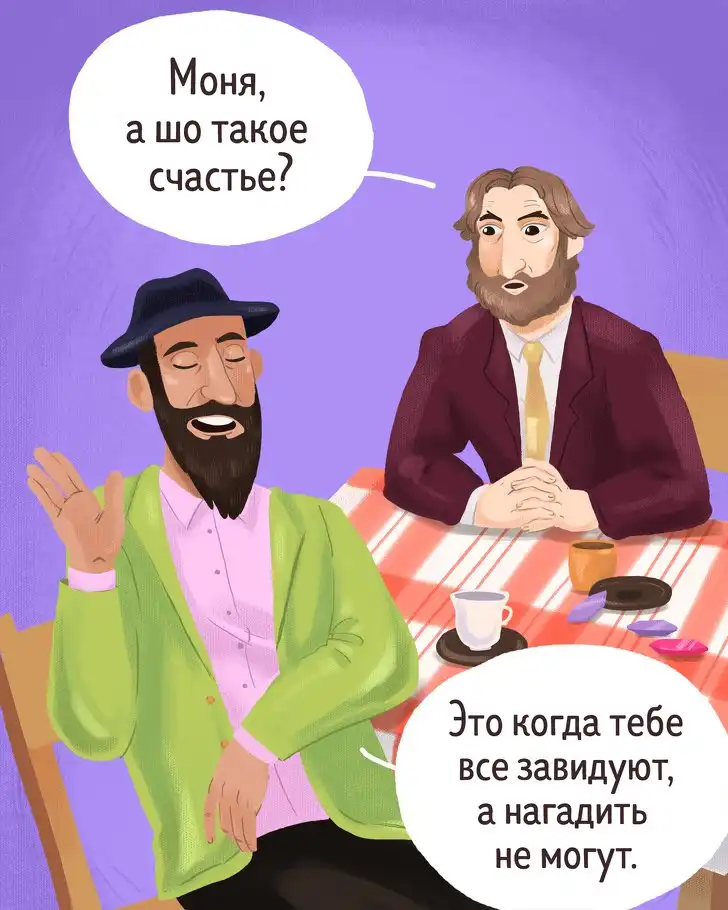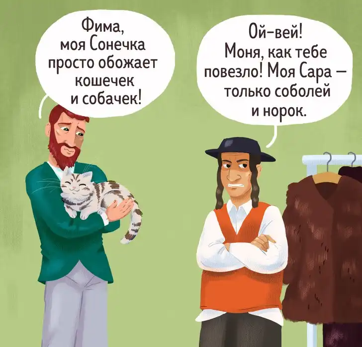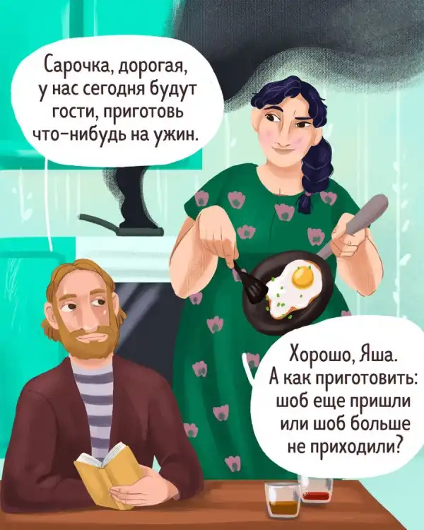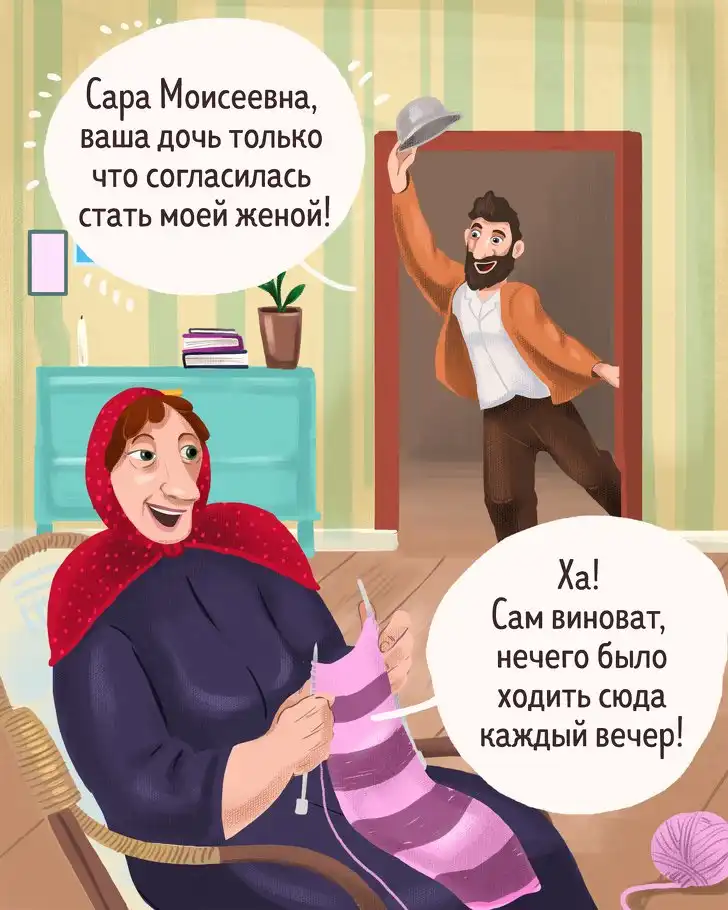 О проницательном уме, острословии и крутом нраве евреев слагают легенды — и неспроста. Их мудрость не обходится без тонкого юмора и выразительности, которые попадают в самую точку. Сегодняшние иллюстрации пронизаны духом этого народа и щедро сдобрены искрометными диалогами.