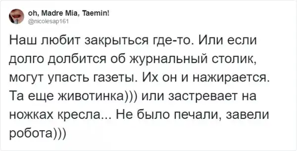 Робот-пылесос - это очень неоднозначная вещь. Половина человечества мечтает заполучить эту штуковину, а другие заявили, что это самая бесполезная вещь в доме. Робот-пылесос действительно может оказаться очень полезным помощником, но также он может создать массу неприятностей. Поразмыслив, пользовательница Твиттера пришла к выводу, что это роботы очень похожи на котов и привела убедительные доказательства.Затем владельцы роботов-пылесосов поделились своими забавными историями, которые подтверждают теорию пользовательницы.
